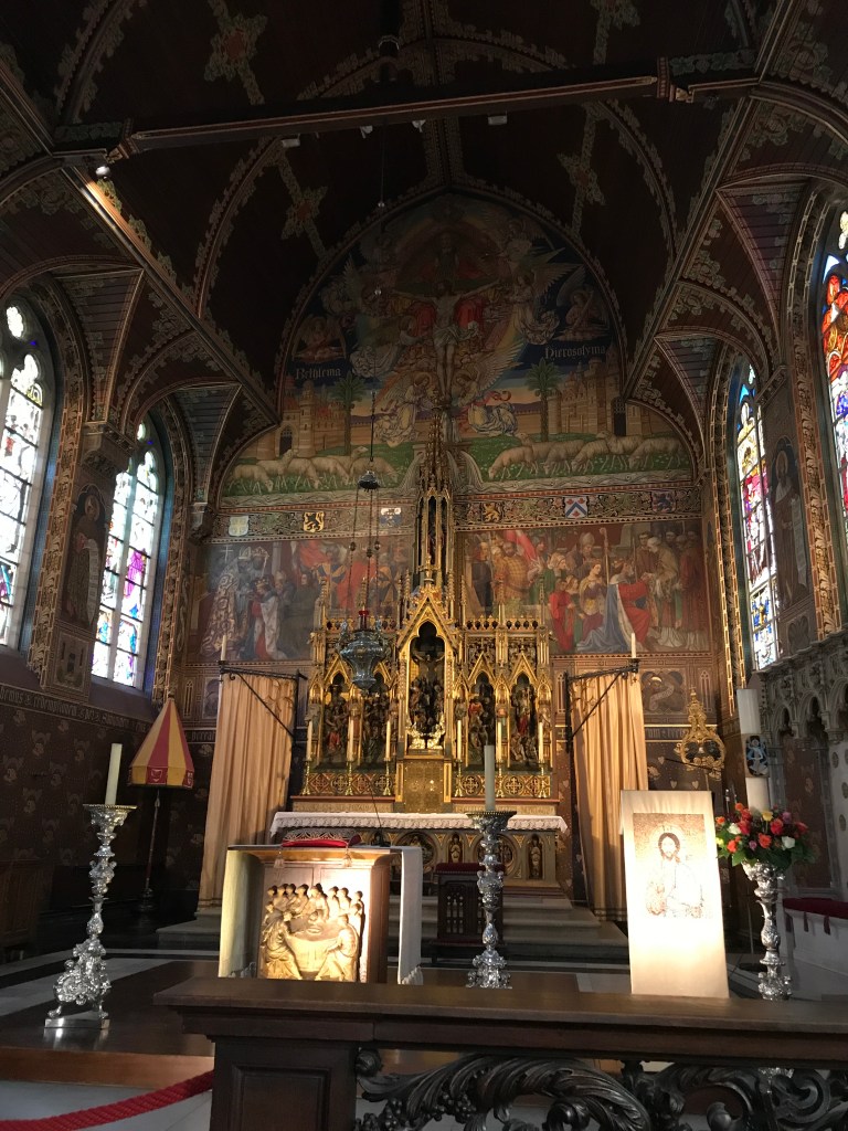We returned to the center of the city and Jef wanted to check out one of the churches on the square. It is called the Basilica of the Holy Blood. I read about it earlier, but didn’t realize that was where we were headed. While we were inside there was an announcement that they were going to have a veneration that would last for five minutes and you should remain seated. We looked around and took seats in front of the smaller altar. The priest and his helper came out holding a giant vial. It is said to contain drops of the blood of Jesus Christ, which was brought to Brugge in 1149 from the Second Crusade. It is only shown twice a day and we were there to see it. What was even more interesting is that they had all the people seated walk up the steps and look at the vial on their own. We were in that group of about 50 people that were able to examine the blood while the helper (it was a woman so I’m not sure her title) watched us and gave us a pamphlet when we were through. It looked like a cloth stuffed into a large vial with some red staining. It was amazing that we were there at the right time. If you are religious, this is a must see.