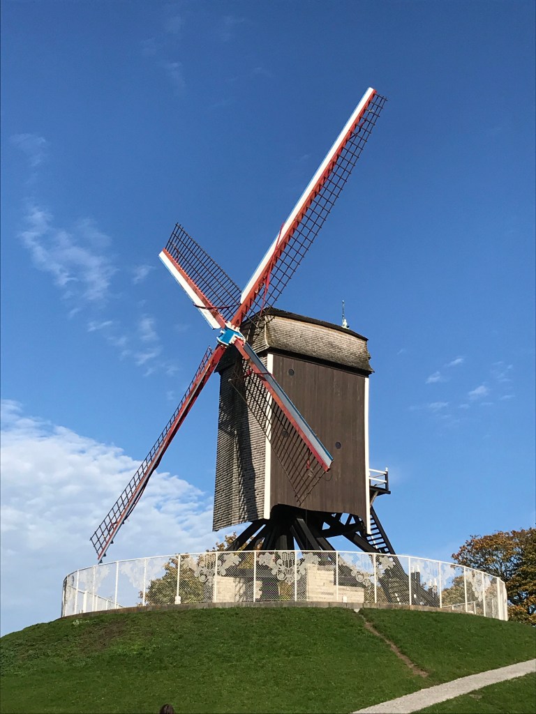 We walked all over town taking pictures of the houses, the canals, the bridges, and just about everything because it was so picturesque. After lunch (mussels!) we wandered to the other side of town to see two of the four windmills that are still standing in Brugge. There is still one left that has been grinding flour since 1770 and you can go in and visit. We missed the opening time, but it was still an awe inspiring sight.