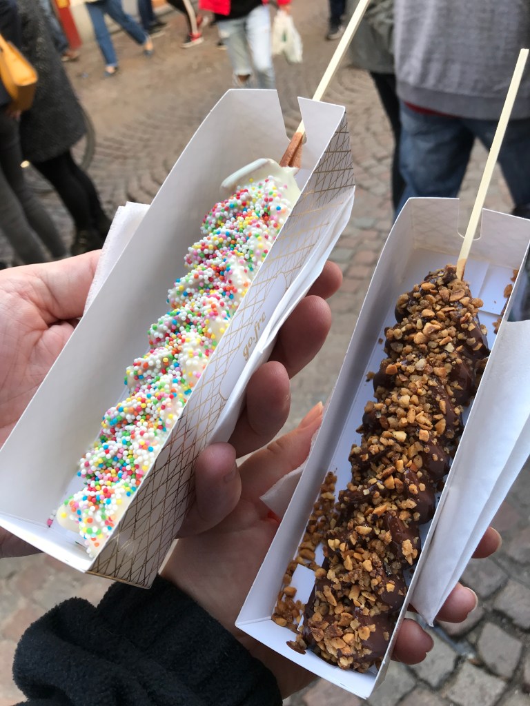 Waffles are another big treat in Belgium. We tried the regular waffles, but these were a different take in Brugge. You bought the waffle on a stick, which they made in front of you, then you could coat it with whatever chocolate you choose, and a topping. It was more expensive than a regular waffle, but it was so good and not as big, so I thought it was worth it.