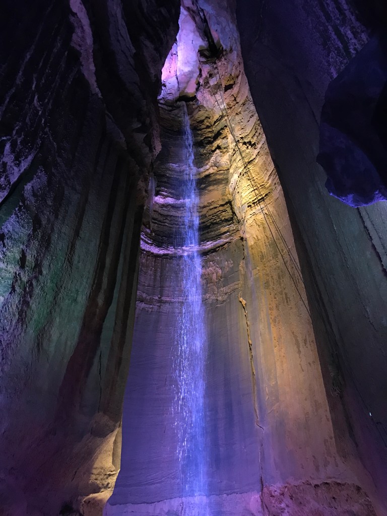 After lunch we had a timed appointment to enter Ruby Falls. It is located on/under Lookout Mountain. Johnny Cash and Roy Orbison co-wrote a song called ”See Ruby Falls”. You have to take an elevator down 260 feet. We were required to wear face masks at all times. Our ride in the elevator was the two of us and the elevator operator. Even though they asked us to give six feet of space while walking through the cave, sometimes this was not easy with other groups passing us by.