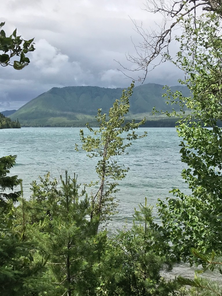 We arrived in northwestern Montana during a cold snap. The highs each day have not reached 60 degrees. Since we are coming from Florida, this was a welcome change. I was excited to be able to wear pants and sweatshirts for a few days. Our first full day in town we decided to drive out to Glacier National Park. The weather forecast said it would be partly sunny, but the clouds on the mountain said rain. We drove out anyway. Sadly, the entire east side of the park is closed since it is a part of the Native American reservation and they closed it due to COVID19. When we drove into the west side it was free and I asked the person at the booth if there was information on what was open in the paper she gave us. She didn’t know. It turns out that the road was closed after LakeMcDonald Lodge. This was a real bummer for us because we were looking forward to heading out on the long drive on Going to the Sun Road. We didn’t realize that the road doesn’t usually open until at least July 4 because there is still snow on it! There were only a few trails open on the road, but hikers and bikers were allowed to go past the Lodge. There were A LOT of people there considering there was really not a lot available to do. We figured we could go on opposite road the next day, but it was cloudy again. The lake is still beautiful.