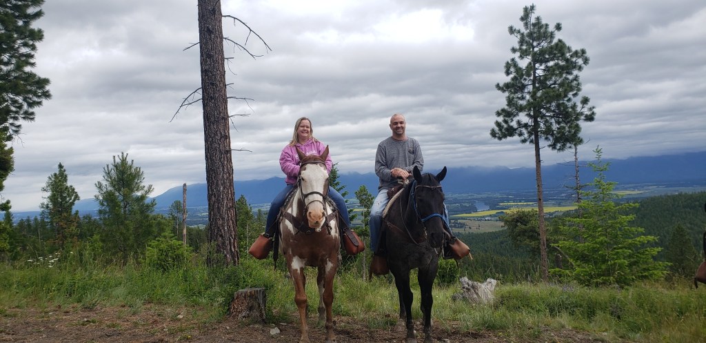 Today was my birthday and I wanted to do something special. The boat tours to Horse Island are closed, so I thought we should be more up close and personal with horses and booked a trail ride. We scheduled a two hour ride at Artemis Acres Paint Horse Guest Ranch. You could go for a one, two, or four hour ride and I believe the four hour includes a BBQ dinner on certain nights in the summer. I was impressed with the knowledge that the wranglers had about the horses and their personalities. I was the only person who opted to wear a helmet on the ride (there were seven in the group) and therefore got the slowest, best behaved horse, Jack. I didn’t care. We were walking anyway and it gave me license to search the surrounding area for wildlife. We saw a deer and her fawn. I would highly recommend this ride. It was up the mountain on horse trails and a logging road and we saw some spectacular views. It was really fun.