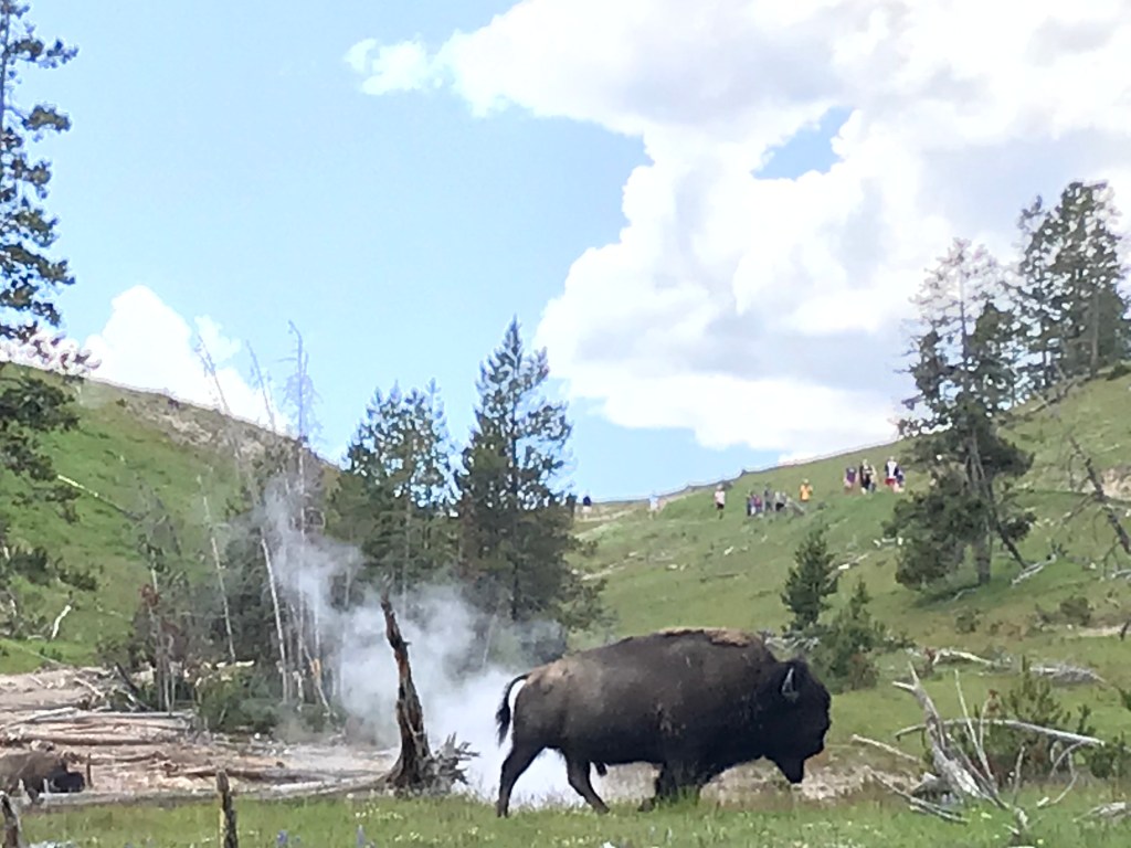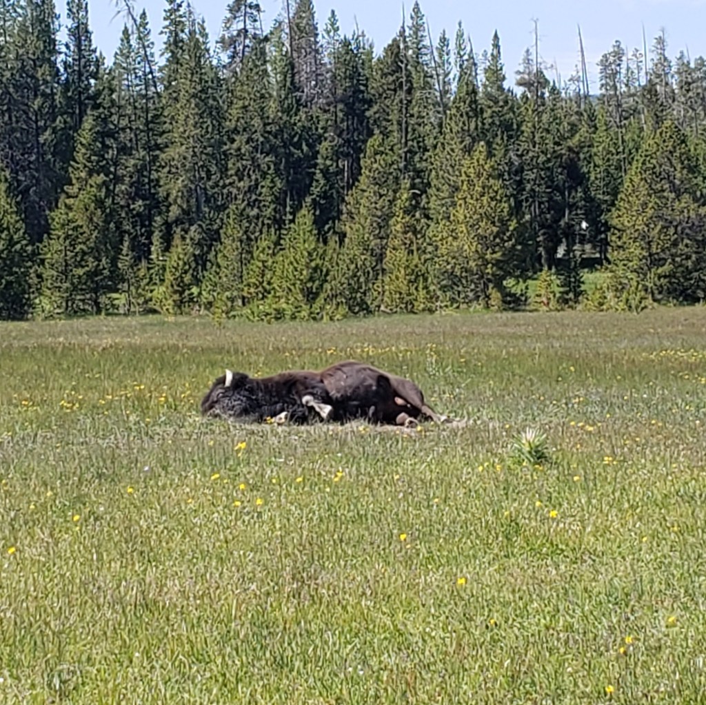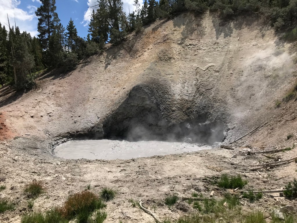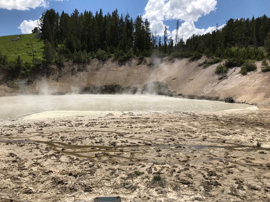 We got tired of driving and getting stuck in traffic at the places you could visit. We did stop at one last area, Mud Volcano. The bison hanging around right before the parking area drew us in. We walked the small loop around and saw the opening of the springs, the mud volcano, and a mud cauldron. As you are walking you can hear the glug glug of the mud bubbles popping. The smell was also a bit different from the other springs. You could definitely smell the mud along with a bit of sulphur. I’m excited for tomorrow and more discoveries.