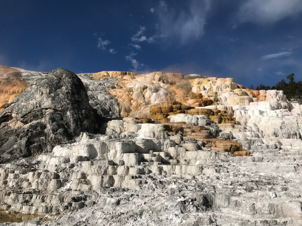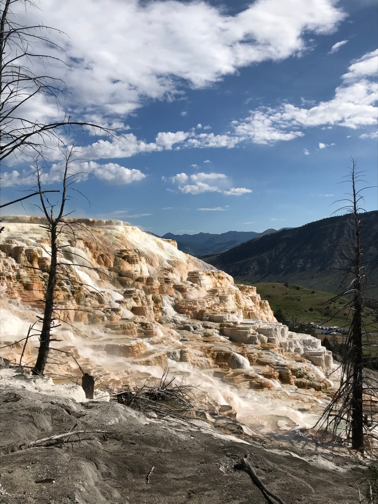 Driving through Yellowstone on the Fourth of July may have not been our smartest move, but we started out early and was able to see quite a bit of the park. We are staying in Gardiner, MT and therefore are right next to the North Entrance. After checking out a couple of elk hanging out by the inn, we stopped at Mammoth Springs. It was only about 60 degrees, but walking up and down the walkways in the elevation quickly made us lose our breath! The views were also breathtaking.