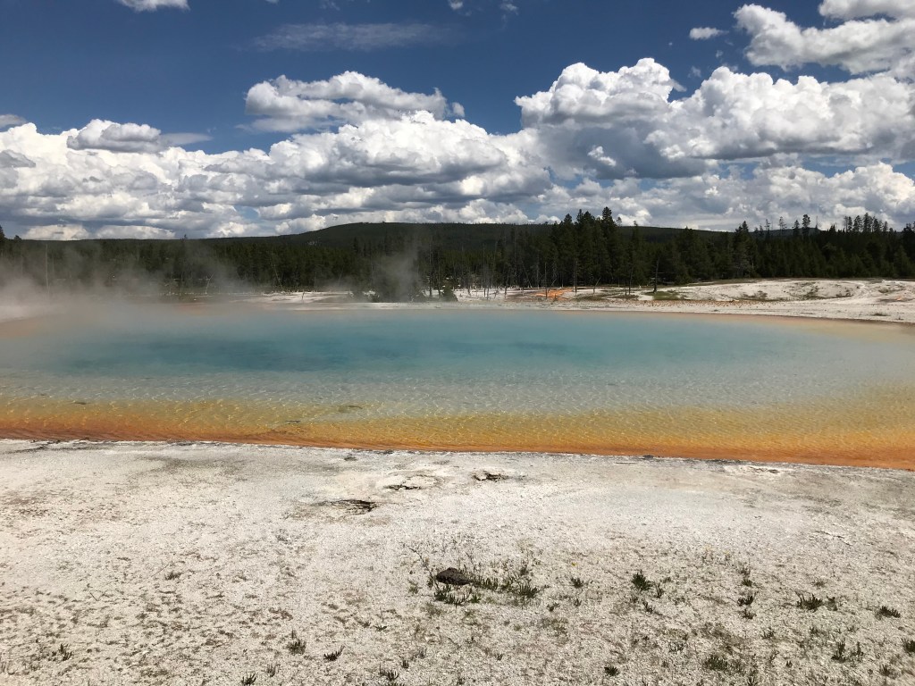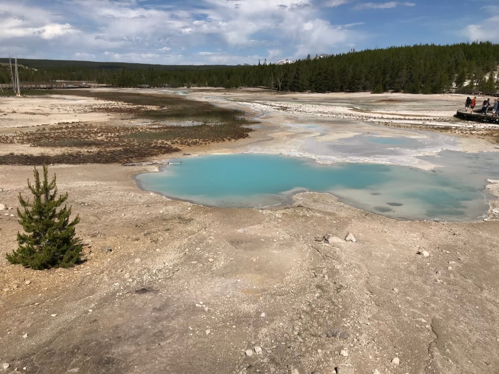 We managed to stop at a few geyser areas, but it was difficult because the more popular ones had no parking places. The first one that we stopped at was the Norris Geyser Basin. We ended up behind a big group of people as we walked around the boardwalk. We saw them from afar when they were laying on the boardwalk trying to touch the water. I couldn’t believe it! There are signs everywhere that ask you to stay on the trail, not touch anything, not throw anything in the water. This was the same area that we saw a cowboy hat lying in the basin. I am now not surprised that so many people get hurt in Yellowstone. It doesn’t seem to matter how many signs or flyers they post. There are still people who don’t listen. It’s frustrating.