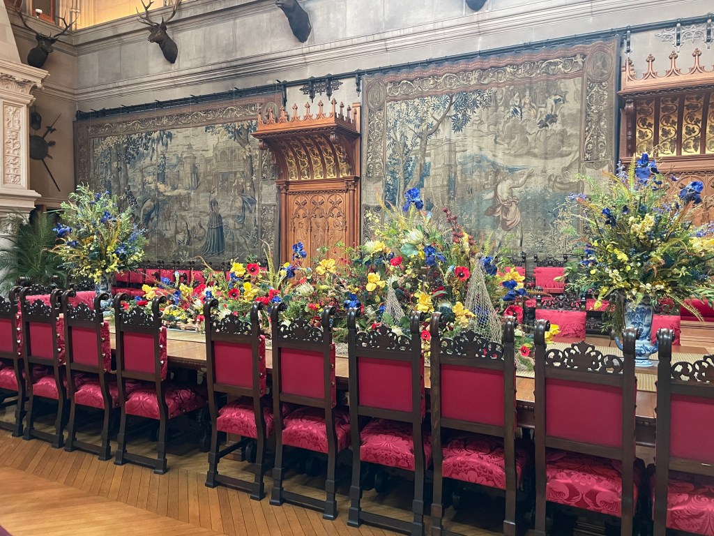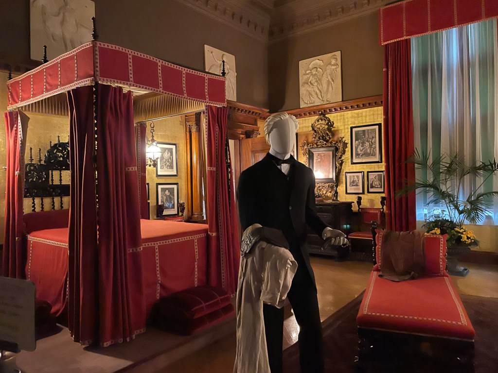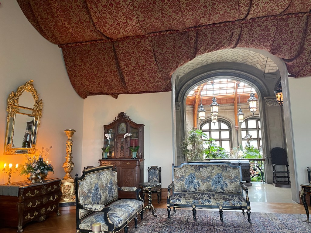 We stood in line and Jef was given a mask because he was wearing a gaiter. He bought the tickets and opted not to get the audio guide. I wish that we had it, but we can always get it next time. The house is a self guided tour so you can stand in the rooms and gape all you like, but there are quite a few people ahead and behind you gaping as well. We had a pamphlet that gave highlights of each room and that was sufficient. During our time there, they had special flower arrangements in each room. They were pretty amazing. You can see examples in the banquet room in the above picture.