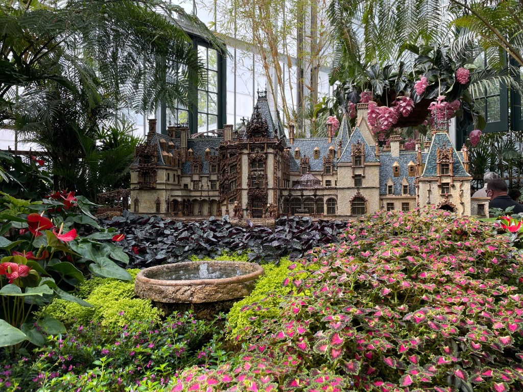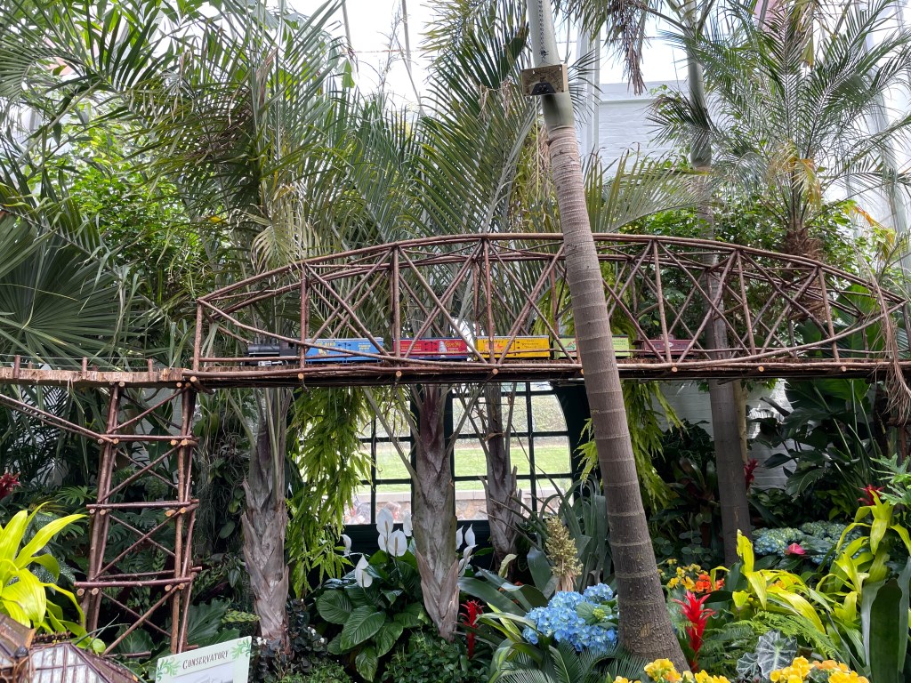 I needed to find a restroom and I knew there were none we could use in the house, but we totally missed a whole section to the right of the house that had restrooms, a bakery, ice cream shop, christmas shop, candy shop, and gift shops. Instead we walked all the way to the conservatory and I inquired there. There was a line to enter the greenhouse/conservatory, but the facilities were on the other side of the building and it was not necessary to enter. Afterwards, we took our place in line. The wait was not long and the line never went down outside. Inside they had a special exhibit with a train running around the greenhouse. It was really neat and the greenhouse itself was very special. I really enjoy looking at flowers and there were quite a few that I had not seen before.