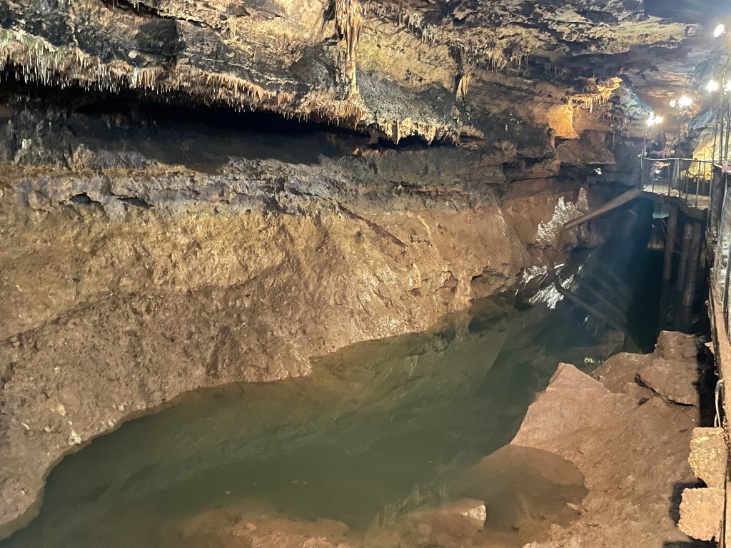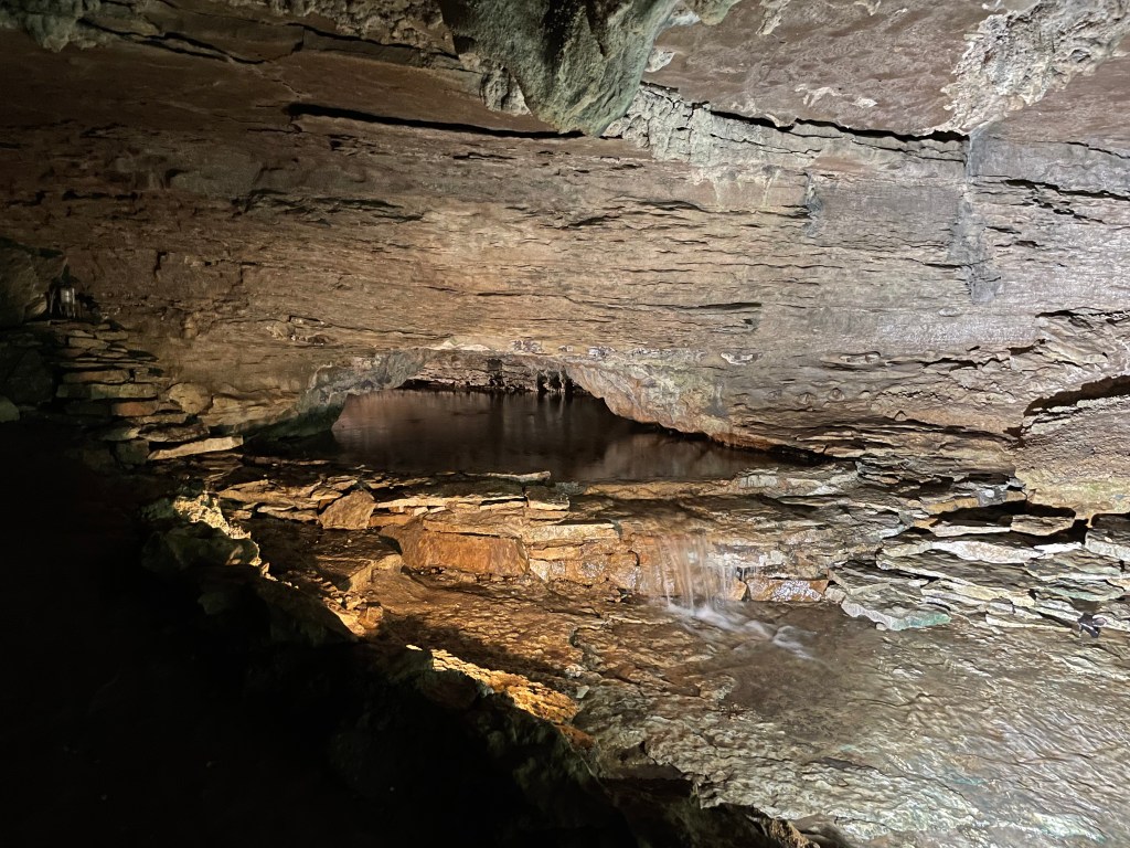 Did you know that there are 2,000 documented caves in Arkansas? There are eight that are privately owned that you can tour. We picked two to see on our road trip. The first one was Cosmic Cavern in Berryville, AK. It calls itself the largest privately owned show cave in Arkansas. We picked this cave because it has a ¨bottomless¨lake. The tour cost $20 per person and take an hour and 15 minutes. It is a cool 64 degrees inside and you don’t need a jacket. If you read their website it sounds like a leisurely walk. It is not. There are quite a few stairs that are very steep and wet. There are also some spaces in which you have to duck low and shimmy around some ledges. None of it was dangerous, but if you are claustrophobic I wouldn’t recommend going on this tour.