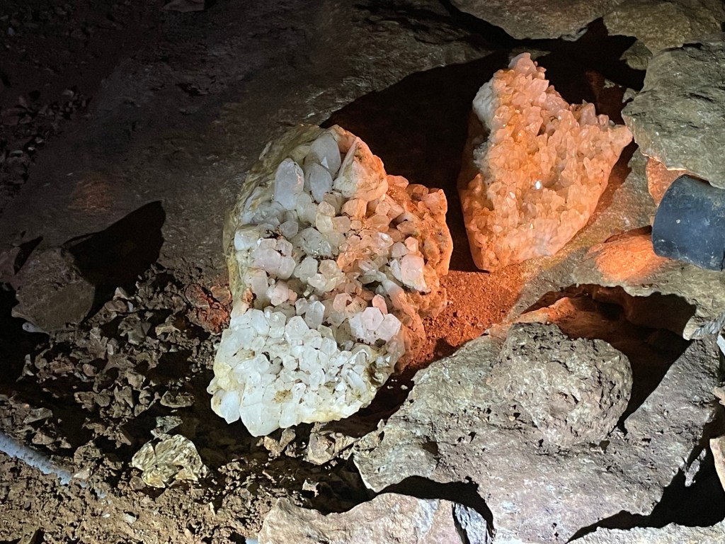 Our tour guide, Jeremiah, was full of interesting information and was quick in answering questions. I liked that he even checked one of his answers with another tour guide to make sure he was correct. (That is the teacher in me.) We went down the first set of stairs and stopped in one room where he explained that the tour used to be mined by minors. There is significant smoke damage to a lot of the rock because that it what they used to see. The rock they mined they used for the gear shift in early motor cars. If you shine a light through it, it is see through. It looks like a glowing night light of rock. It didn’t make the owners much money, so they kept exploring. They are still doing so to this day. This tunnel started ten years ago and they have only moved about 60 feet. This is partly due to the mud they need to remove and partly the time constraints.