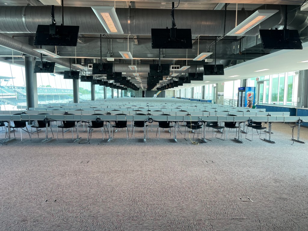 We were then taken to the area next to the Pagoda and up into the media room. It is a huge space that can fit three hundred people. The beautiful glass windows overlooking the track are wasted on them since they are staring at computer screens and monitors. They spend all day there and get three meals in the cafeteria on the floor below.