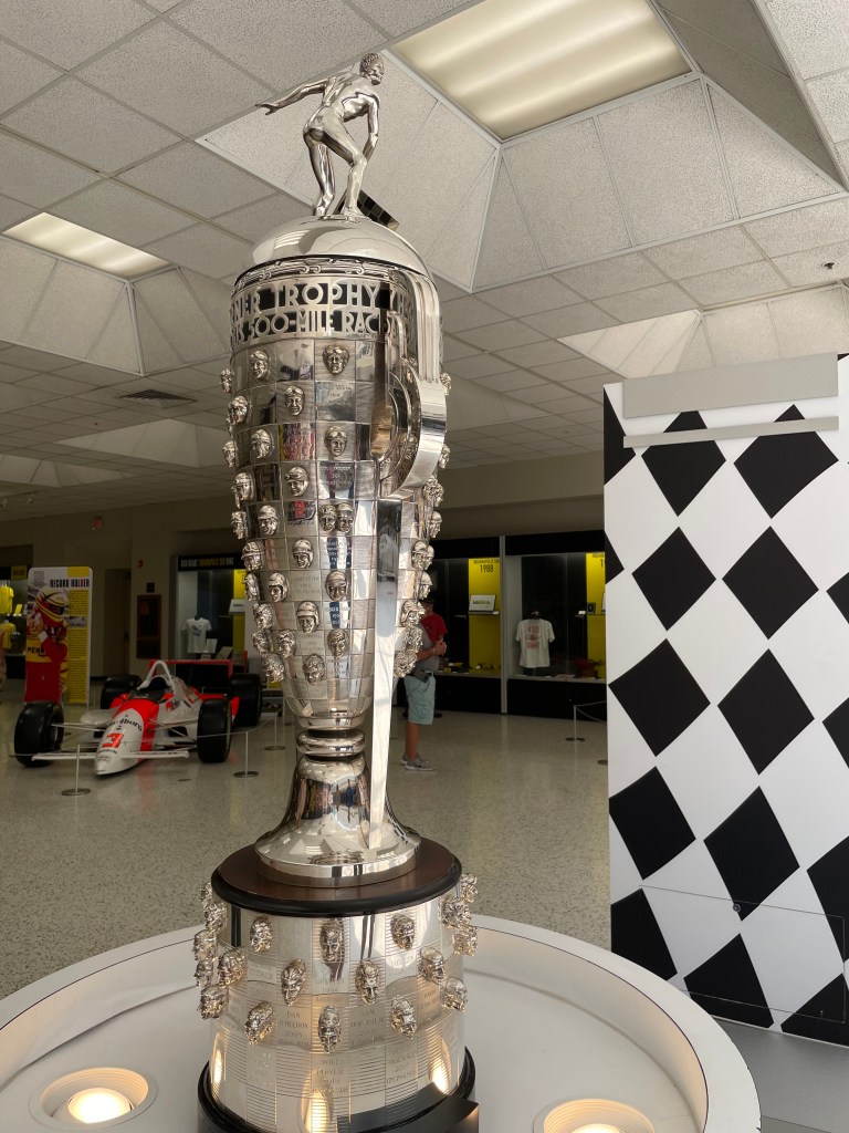 We walked down to the winner’s circle after the media room. The tour guide told us about the tradition of drinking a glass of milk after winning. It was started innocently by a winner who just loved buttermilk, but the dairy association latched onto it and had milk for every winner afterward. He told us stories about one winner who was allergic and STILL took a sip. This is probably due to a story about a man who won and refused the milk and was booed profusely. The cool part of the winner’s circle was the lift that brings the car up with the driver. We also learned about the trophy (which you can view in the museum after the tour) that has every winners´ face on it.