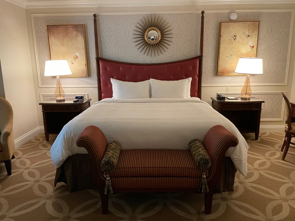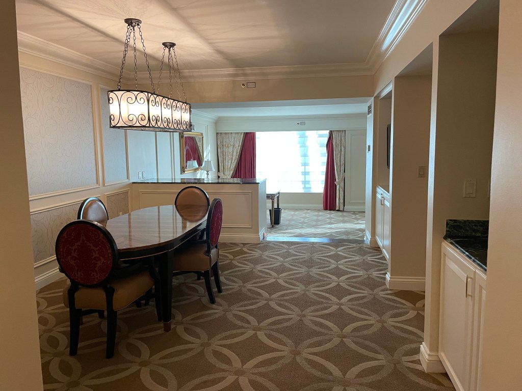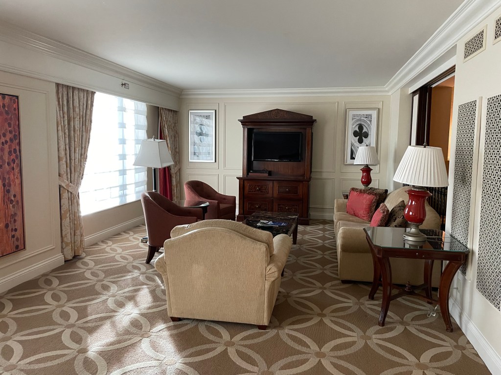 The suite was very large. The view was similar to the lounge, just five floors below. We had three tvs and we requested an extra fridge (because the one they provide is filled with drinks and you cannot touch them or you will be charged), but when we arrived it was already there under the bar area. The suite was impressive in size and view, but it is not updated and it is showing its age. The automatic curtains had an issue closing and there was a random hole in our bathroom area that was clumsily resealed. The bed is comfortable, but does make a weird noise when you first get into it.