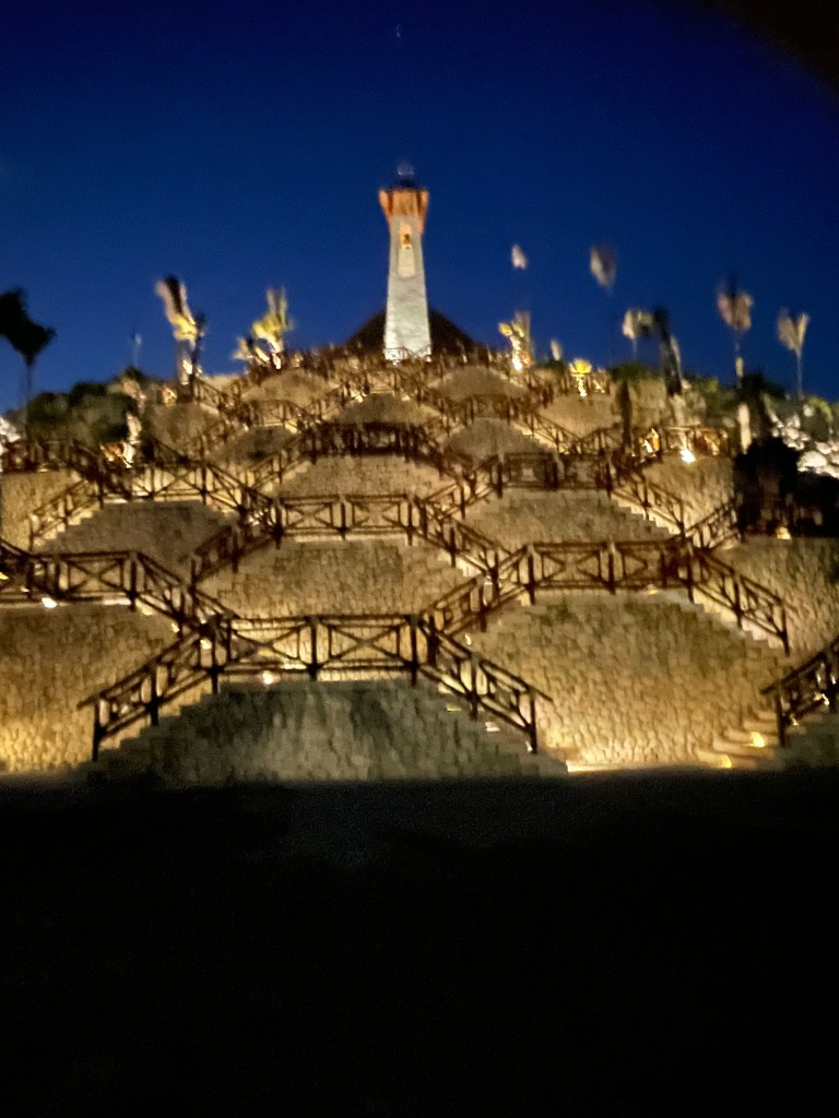 We explored the hotel a bit on the first day. It is massive. It was also confusing because you could easily go into the Mexico area or even the Casa de los Artistas (which is actually a private area). We were allowed to explore anything in Mexico and could eat at any of the restaurants. However, only adults could come into the Arte area. The decorations at Hotel del Arte were wonderful. There were musical instruments, furniture made from tree roots, weavings, and lots of traditional Mexican art. The hotel itself is beautiful. You have to cross hanging bridges between floors (which Jef loved to jump on and make me nervous). There is a beach, but also a section with ocean water blocked off from the beach so there are no waves or wind, but you enjoy the sand and ocean water with some fish. They have a rooftop bar on every building with rooms and at least three pools with bars to sit at in the water. In the middle of everything is the pyramid which has a chapel at the top and inside offices for the time share business. You can get a ride on a golf cart to the top.