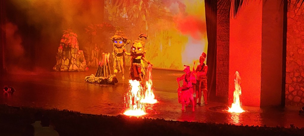 Our room was a river view. It was not really a river. We had a view of the Forum (which was the outdoor theater) and a bar with a pool. We loved being in front of the Forum because we could lay out in our hammocks on the patio and watch the shows at night. They had something happening every night. My favorite was about the animals and the gods. The costumes and props were incredible. We often watched dress rehearsals for future shows after the first show.