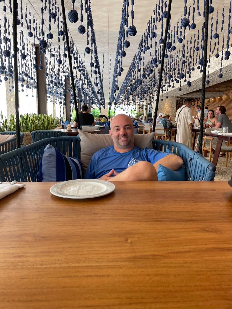 There are nine restaurants at Hotel Xcaret Arte. Four of those restaurants need reservations. We tried to eat at the buffet, but it closes between 12 and 1. We chose the restaurant Cayuco by the pool. It is described as Mediterrean-Mexican. It was a buffet for lunch, but they had pizza and pasta. It was ok. Jef had them make him pasta with garlic and butter. He was not impressed. We found some chairs by the pool under an umbrella and hung out until our room was prepared.