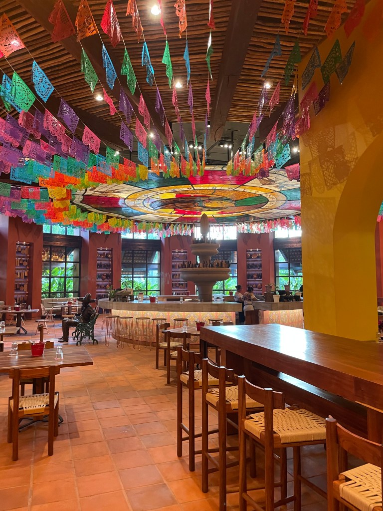 Food was also catered to Mexicans. All the restaurants are a variation on Mexican food: Chinese-Mexican, Japanese-Mexican, Mediterranean-Mexican…you get the idea. The one place that we could both find good food to eat was at the Mercado. It was an enormous buffet. They always had fresh tortillas and you could have quesadillas or tacos made. In the morning they had an omelet bar and in the afternoon and evening there was a pasta and seafood bar. There was salad, cheese, sliced meats, pizza, fresh meats, and a dizzying array of local dishes. I fell in love with Agua de Mango (Mango water) and asked for it everywhere we went. You could get any drink you wanted and there was a station to have tequila and mezcal shots at dinner. We tried the restaurant Arenal, in which Jef had a hamburger that he did not like and my chicken breast was rather boring there as well.