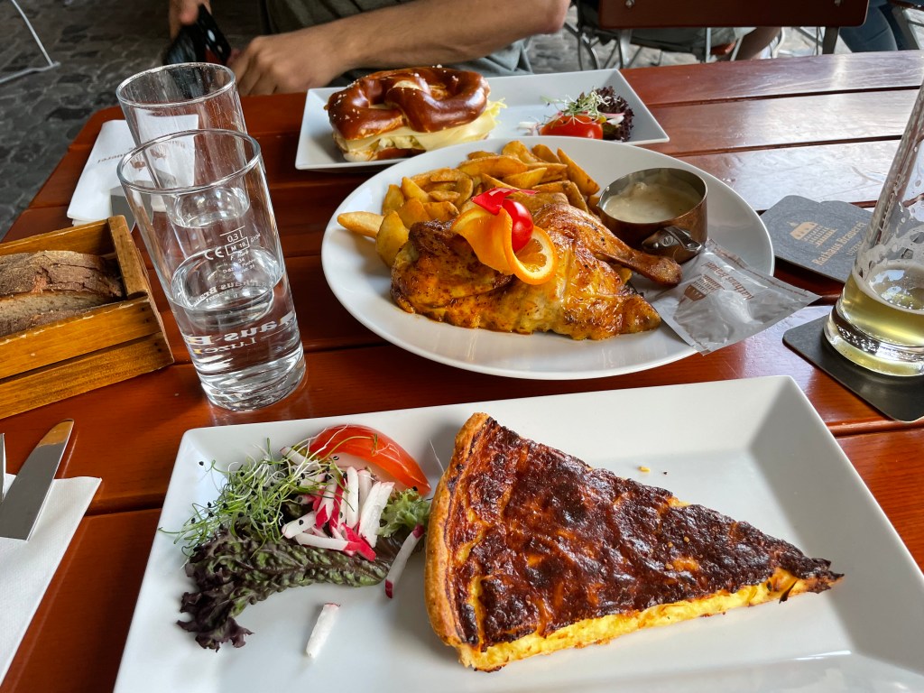 We had cheese pie, rotisserie chicken with an herb cream sauce and potatoes, and a pretzel with cheese. The beer there is also phenomenal, you can see what little is left in the picture, it is very light and refreshing. All that food was delicious and we may go again before we leave Lucerne. If you can grab a table outside it’s wonderful to sit by the river and take in the view and people watch as well.