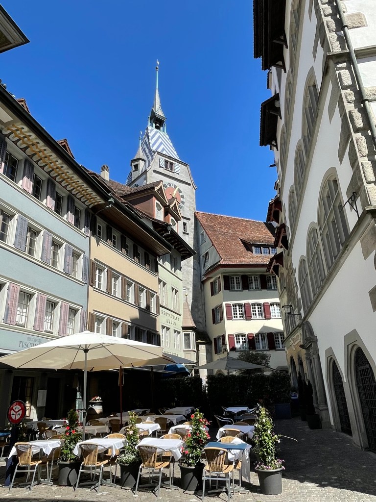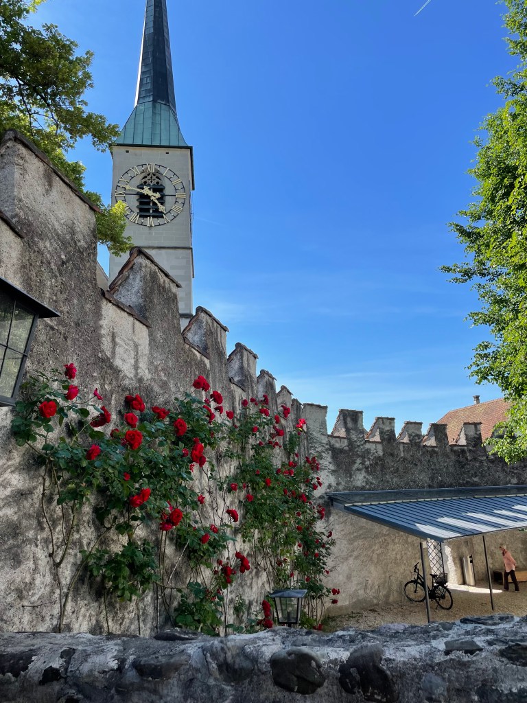 When we docked, we decided to head to Zug for the afternoon. The boat docks are right next to the train station, so we did not have far to go. We stopped at Coop for some drinks and snacks first. The train ride to Zug only took about 15 minutes. There are lots of trains that go there on the route to Zurich and the Zurich airport so you don’t have to wait long. Jef found a medieval castle for us to visit while we were there.
