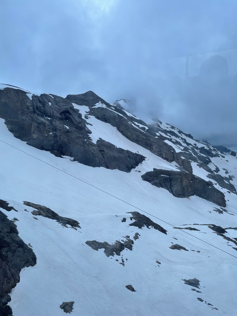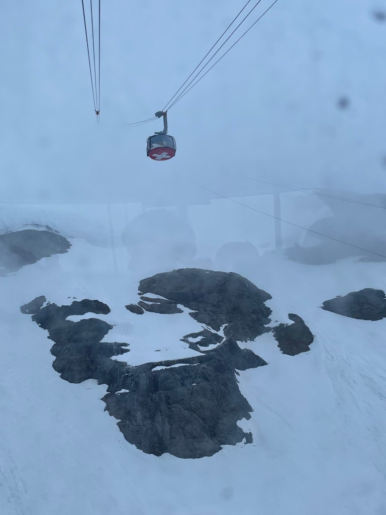 Mt. Titlis is one of the highest mountain peaks in Switzerland that you can easily visit. It’s over 10,000 feet in elevation. As you can see from my picture, it was a partly cloudy day and we took a chance that the top would be in clouds when we arrived. The train from Lucerne to Engelberg took around 45 minutes with some beautiful scenery. We walked from the train station to the bottom of the mountain in about 10 minutes. It was an easy walk. There were signs for a free shuttle, but we did not see it. Mt. Titlis gives Swiss passholders a 50% discount on tickets. The ticket includes a round trip ride to the peak, glacier cave, and cliff walk. Even with the discount, it cost almost $100 for both of us.