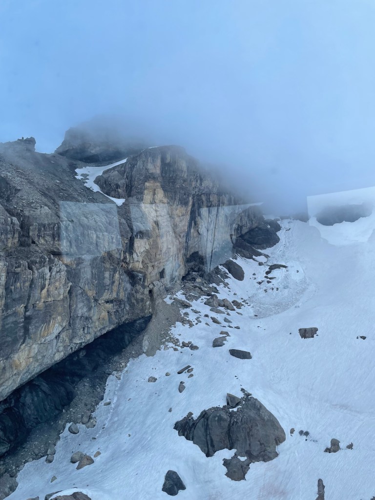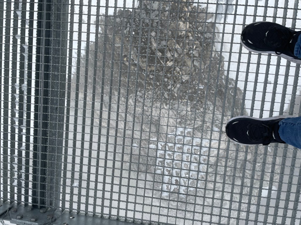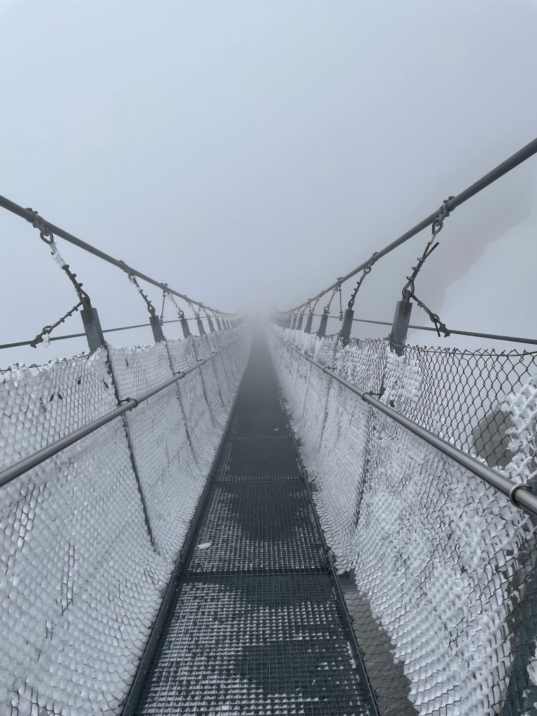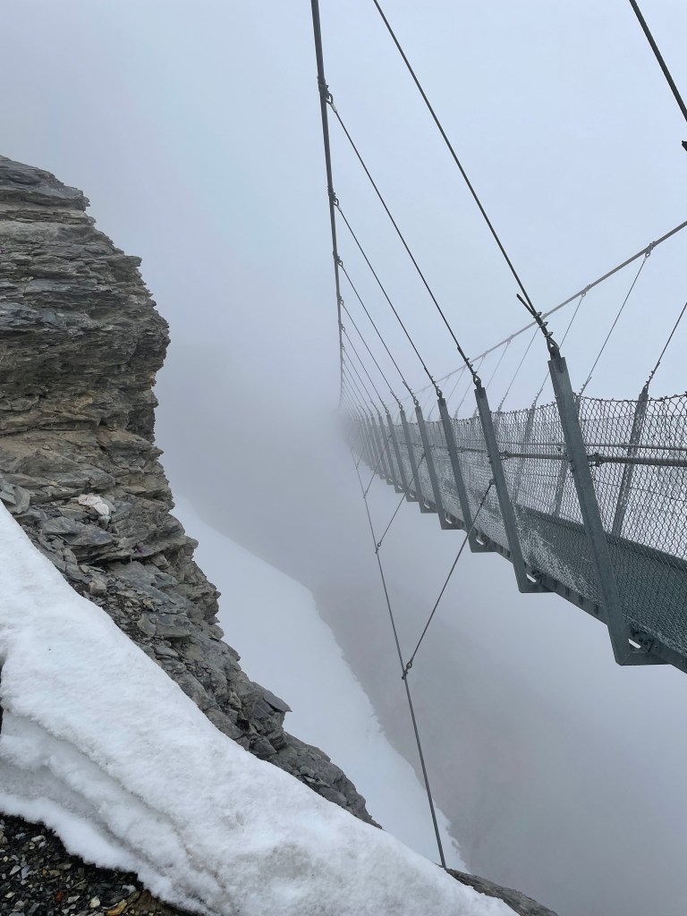 This Cliff Walk is almost two miles in height and over a quarter of a mile above ground. It is Europe’s highest suspension bridge. Yes, suspension bridge, which means it does move when you walk on it. If there were a lot of people on it (it was just us and a family of three) it would move quite a lot. Even though there is not a lot of space on it, you feel pretty safe. The steel wire enclosing each side ensured your safety even if you did slip. As you can see from the pictures, we did not get an amazing panoramic view, but I hear it is the best place to see everything on a clear day. When we reached the end of the bridge, we could hear something scrambling on the rocks below. We were hoping to catch sight of an ibex because it did sound like hooves, but the cloud continued to block our view. I thought it was really fun to walk across the bridge in the clouds because you couldn’t tell where you would end up. I also loved the snow drifting over us as we walked.