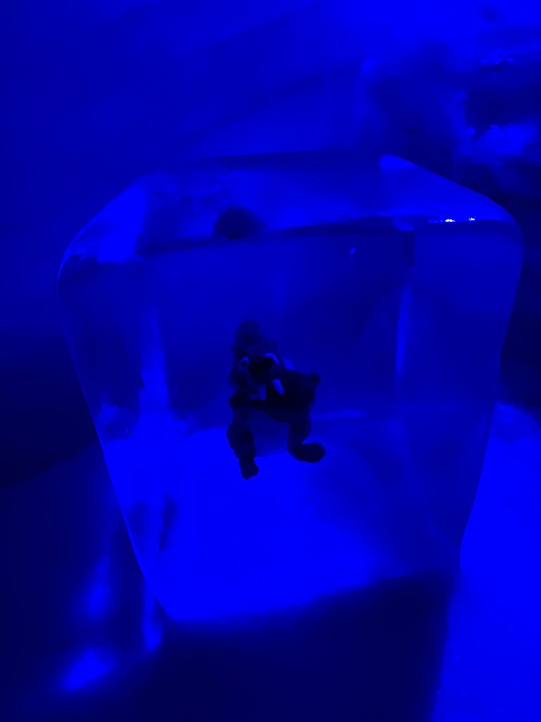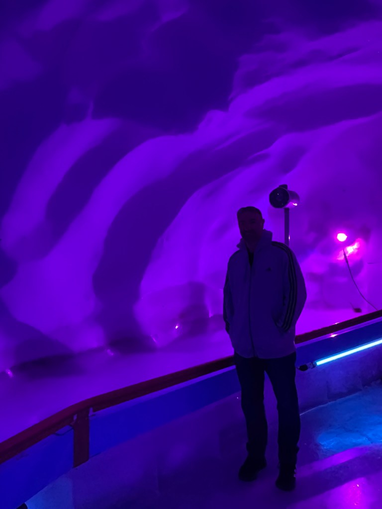 After we explored the Glacier Cave we headed up to Level 5 to go outside. It was white. As we walked toward the Cliff Walk, it got even more white. People were having a good time making snowballs, lying in the snow, and clutching each other while trying to walk in the snow. I didn’t think it was that cold, but it may have been my Maine genes kicking in. Jef said he was freezing. The sign said that the Cliff Walk and Ice Flyer were only 250 steps, but the white out conditions made it seem further.