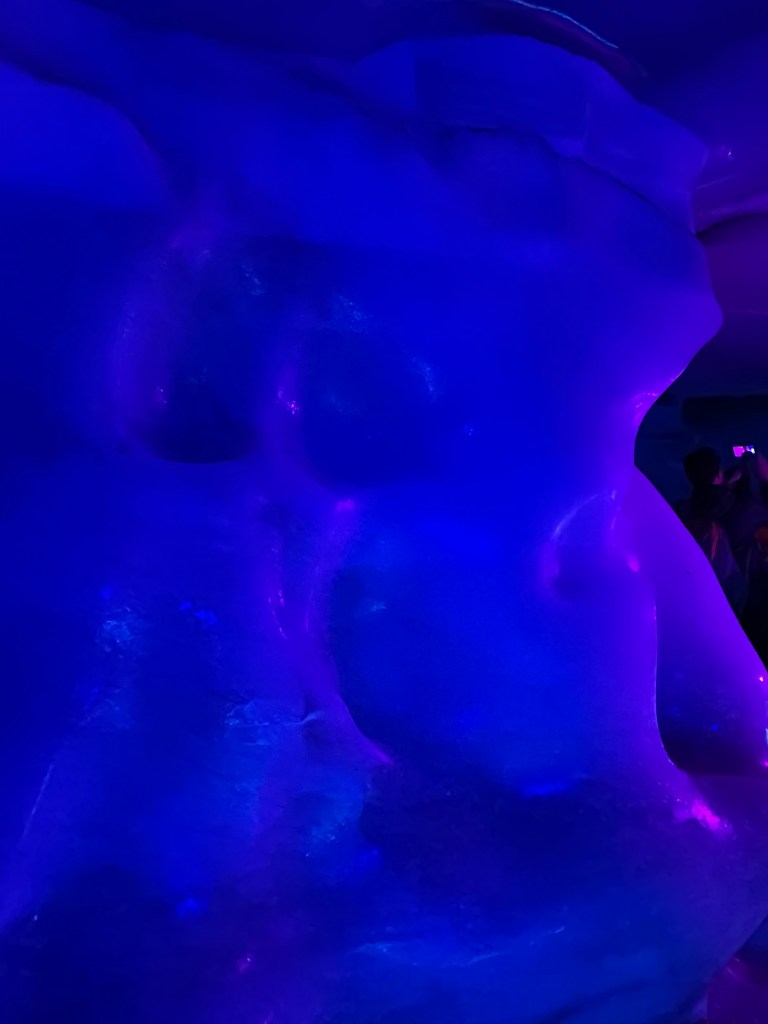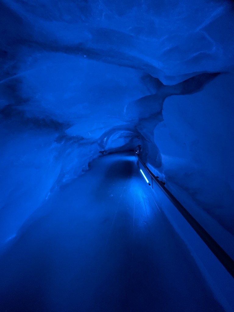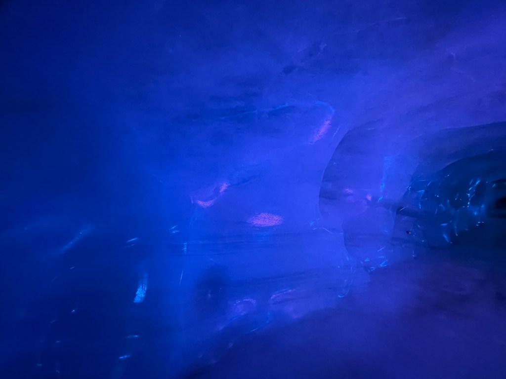 Our views were not spectacular. They were mostly white. It was a bummer, but we decided to make the most of our trip and check out the Glacier Cave. It is about 500 feet long and inside the temperature is around freezing. The ice thickness is between 10-65 feet. The floor is also ice as well so you need to walk carefully. I read a blog that said they change things in the cave each year. There is sometimes a sofa, colored lights, and objects encased in ice. When you reach the peak, there are five levels to explore and the Glacier Cave is on level 1, so we went there first while most people sped upstairs.