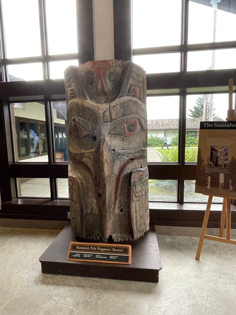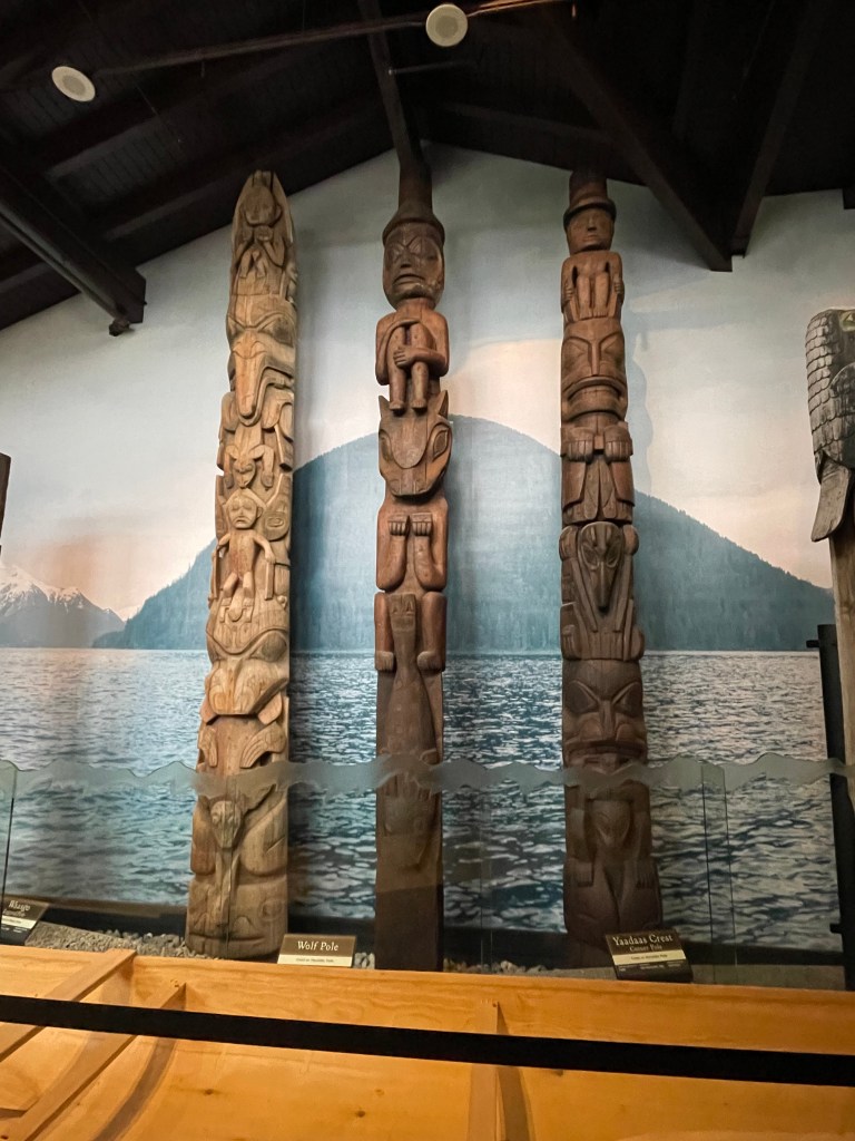 The Totem Trail is a mile loop in which you can view 15 different totem poles by both Tlingit and Haida artists. This tradition started in 1901. Therefore, some of the poles have deteriorated and there are replicas in their place. They are working on saving as much of these poles as they can and you can see parts of them in the exhibition inside.