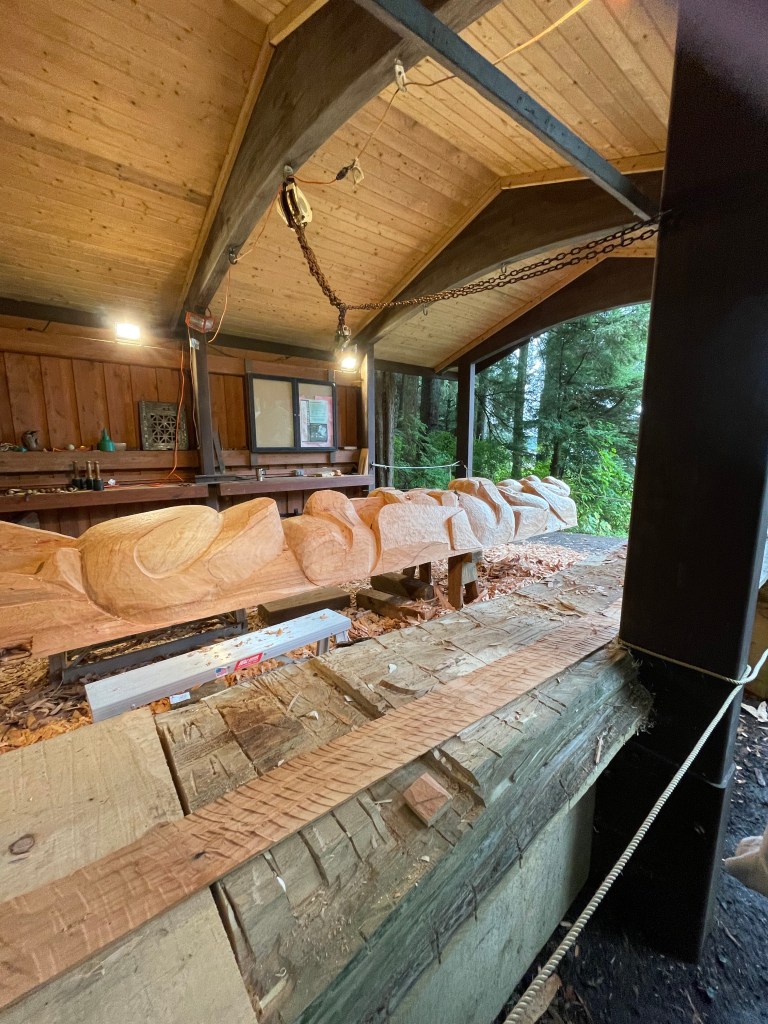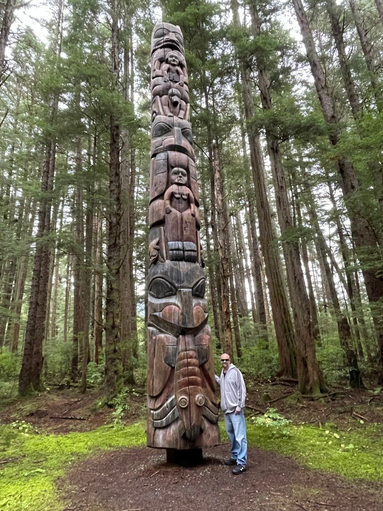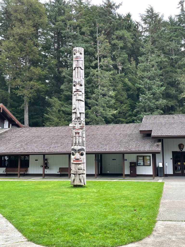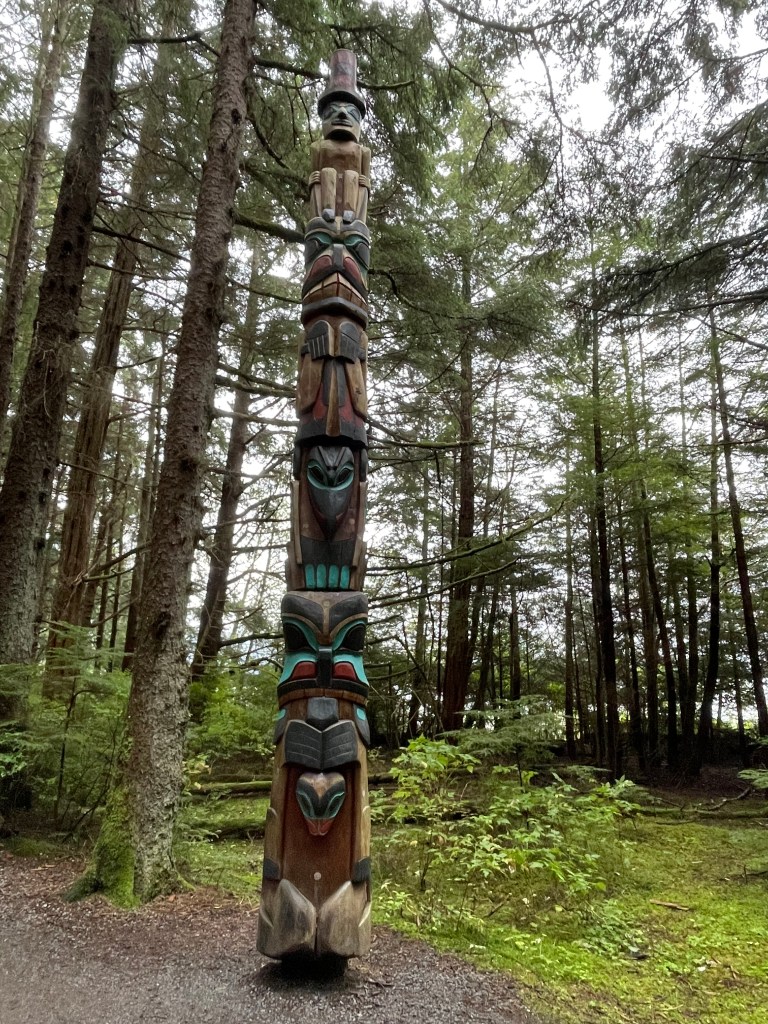 The walk through the temperate rain forest is lovely. There is a warning about bears when you first enter the woods. Sadly, we didn’t see any. The totem poles are public records, displays of identity, and clan pride. There are crest poles which display the ancestry of a family, legend poles show folklore or historical events, history poles, which recount a clan’s history, and memorial poles of individual clan members. I was excited that I could figure out which figures were ravens, wolves, eagles, and sharks. The sharks were my favorite.