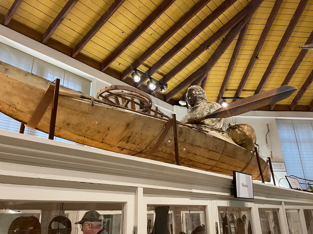 After walking the trails, we decided to stop at the Sheldon Jackson State Museum on the way back into town. This is the oldest museum in Alaska and its first concrete building. It is an octagon shape and has been in use since 1897. It has over 6,000 Alaska native artifacts from across the state. The octagon shape compliments the museum experience. They have cases with windows on either side around the outside of the building and in the center there are totem poles and drawers filled with interesting artifacts.