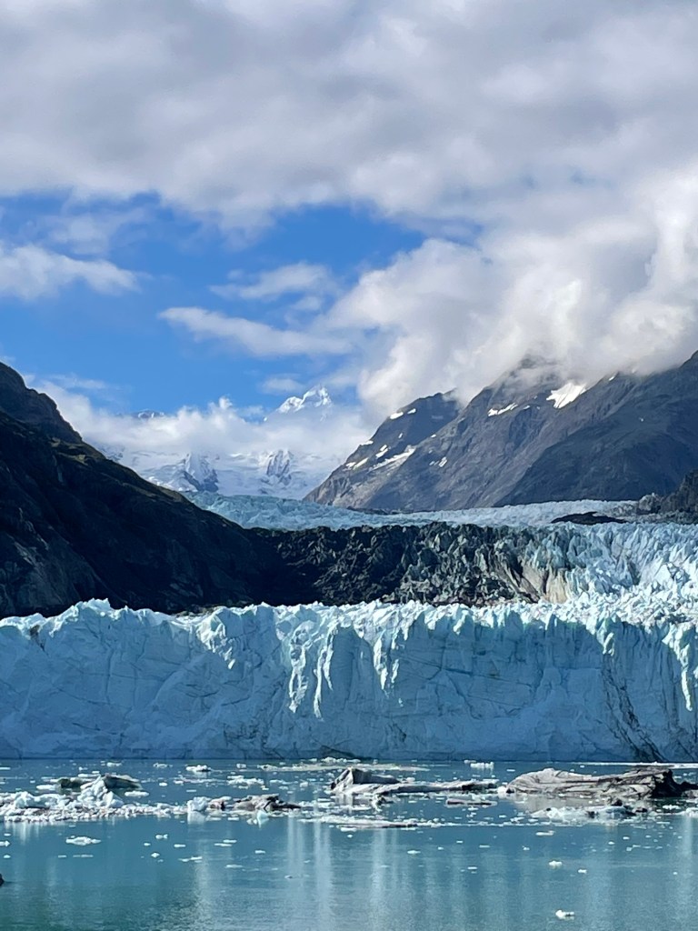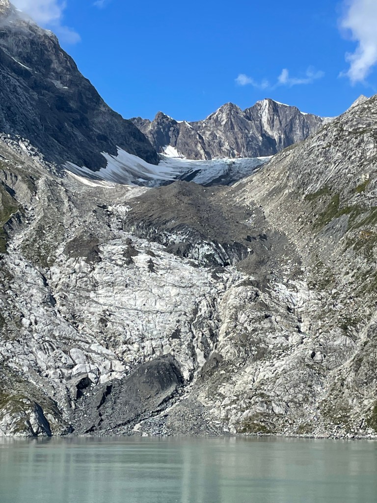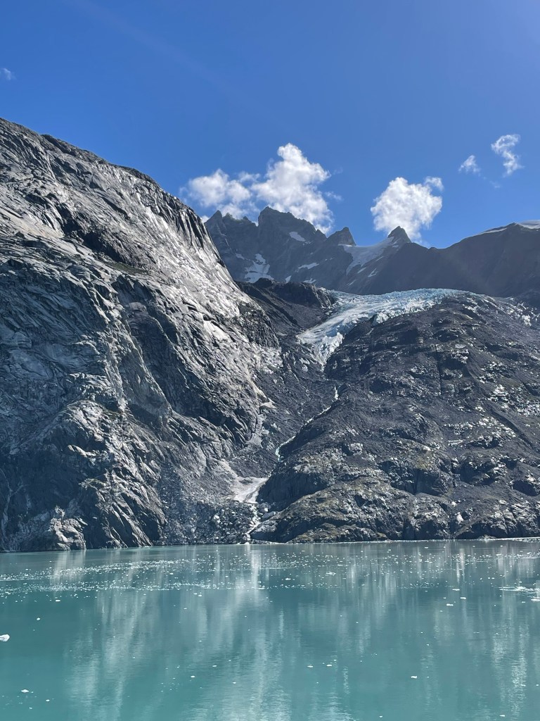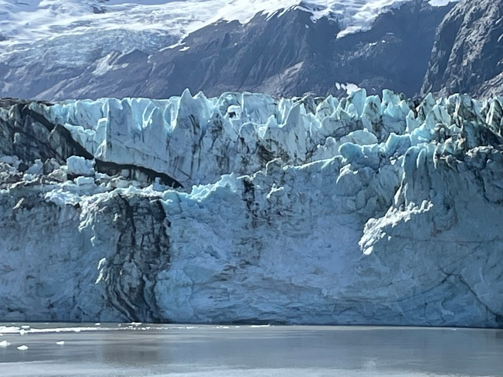 John Hopkins Glacier was named after the university by explorer Harry Reid. This glacier is only open to viewing in September due to harbor seals encampment during pregnancy and birth in this area. It is at the end of the John Hopkins Inlet in the furthest northwestern corner of Glacier Bay. The glacier itself is 1 mile wide reaches 250 feet above the water line and about 200 feet below the water line. It runs about 12 miles long from the Fairweather Mountain Peaks. The black bands come from rocks scraped off the mountainside.