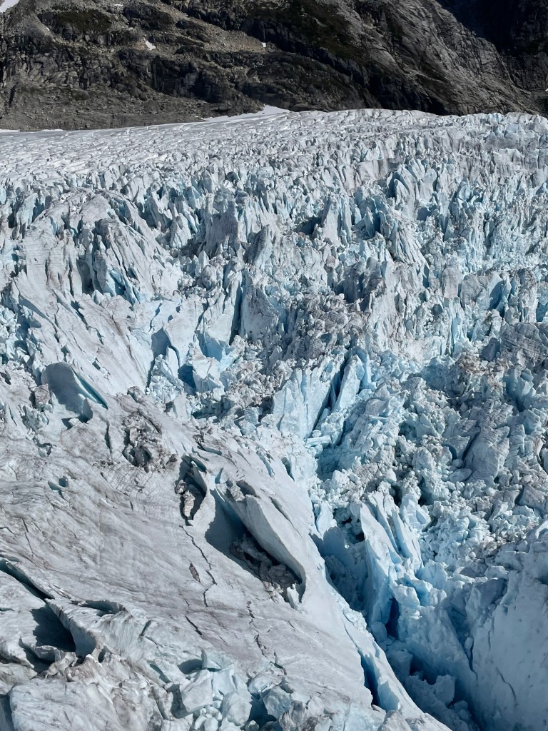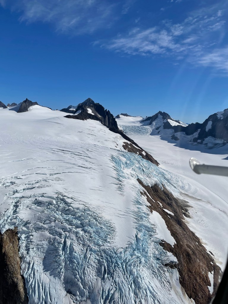 The entire 45 minutes was unreal. I stared out the window in awe. I only had to wipe off the fog a few times. The ice fields just look like fields of snow. As we travelled down toward the end of the glacier you could see more crevasses and fissures. It was amazing.