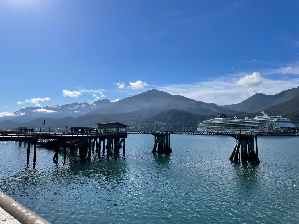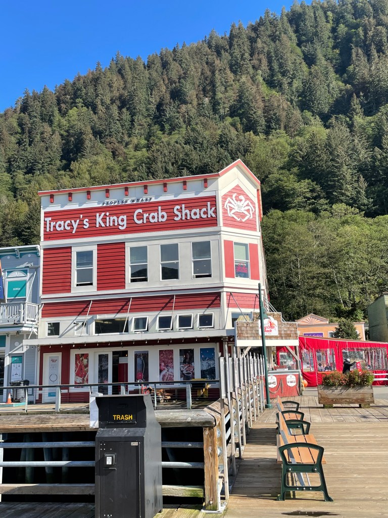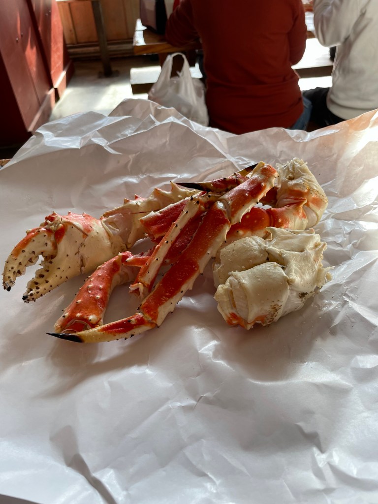 There were a lot of shops to check out, but the tour guide for the helicopters recommended the beer company to find good t-shirts. Along the way, I managed to find a sale on a water bottle with a tribal symbol on it as well as a whale tale necklace with a nice chain. The Alaskan brewing company had a good variety of t-shirts and sweatshirts for reasonable prices and good quality. After shopping, we bought an early lunch at Tracy’s King Crab Shack. We got a pound of king crab (which they steam while you wait) and it was $75. It’s very difficult for them to get king crab and therefore prices are unreal. It was absolutely worth it though. Delicious!