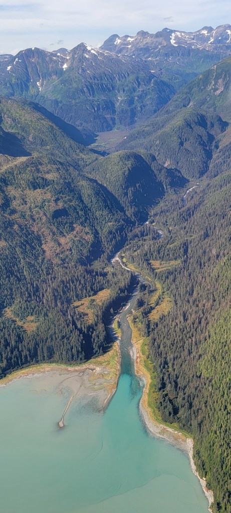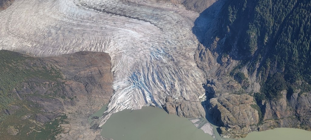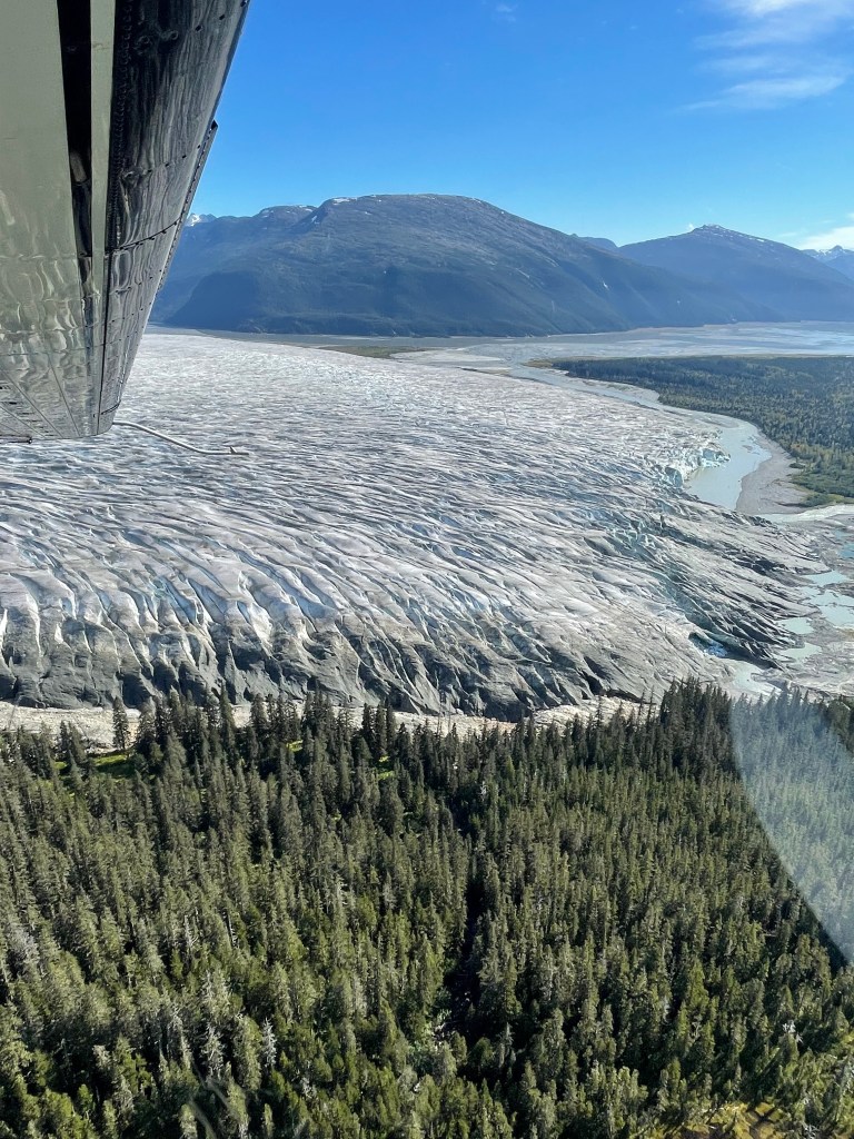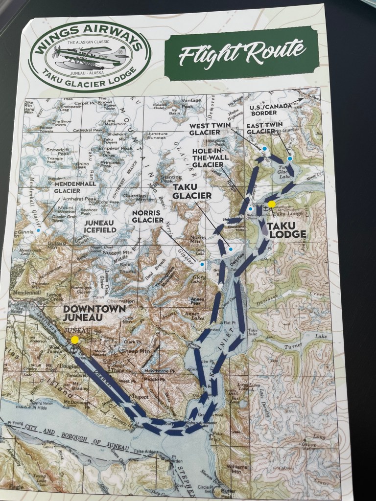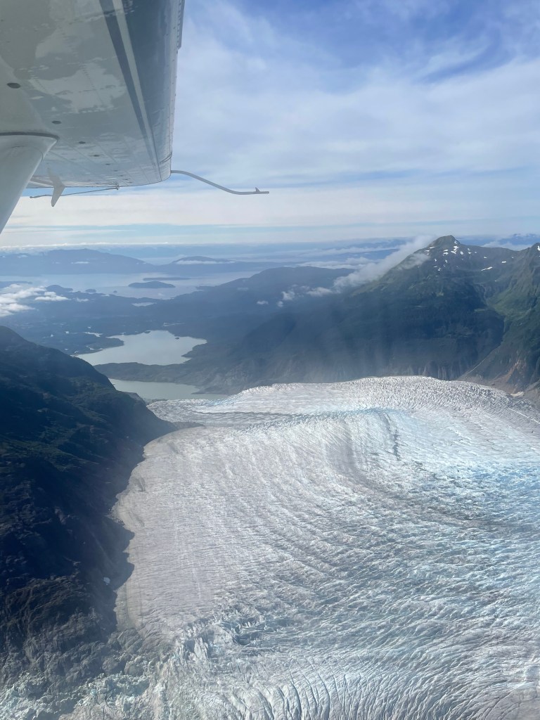 After lunch, we walked the boardwalk over to Wings Airways. We could see all the planes waiting for us at the dock. I opted to leave my backpack in the building onshore. Each plane had about ten seats. The pilot gave us the option of someone sitting in the copilot’s seat and Jef was excited to do it. I sat in the first seat on the left (which is what the guy told us to do when we bought the tour). Jef was on the right, but at the front of the plane, so we got both sides to take pictures. The flight route is supposed to be around several glaciers, but they told us that we would have a chance to fly right over Juneau Icefield on our trip.