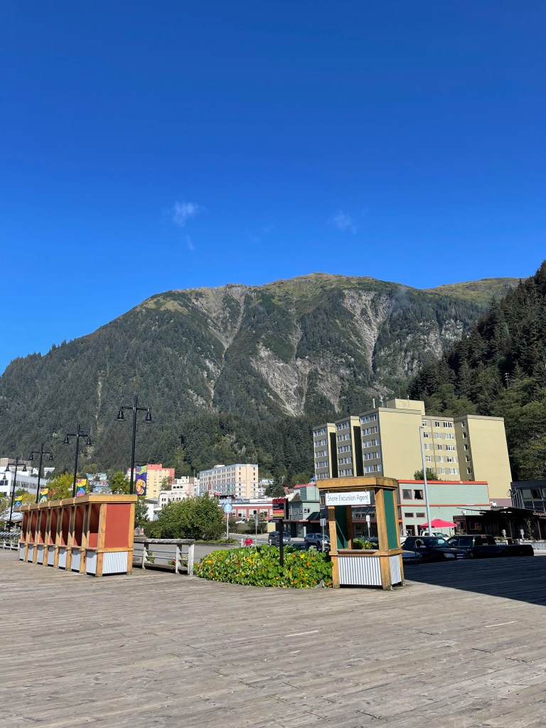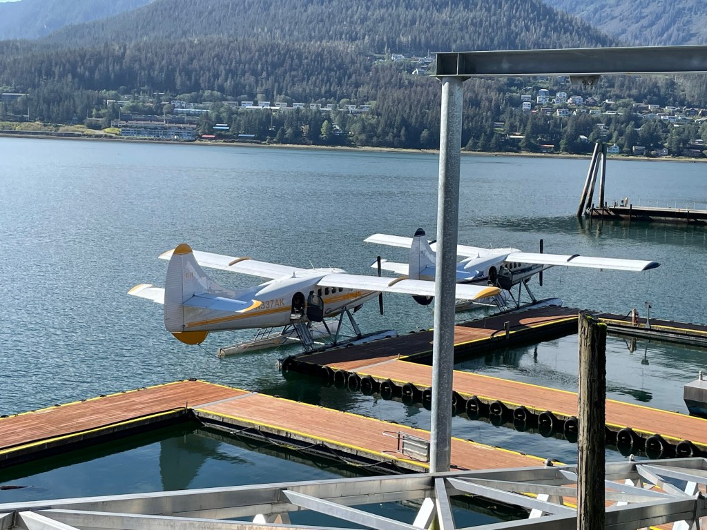 I was really excited about our excursion in Juneau: a helicopter ride to a glacier and then getting out and walking on it. We got up early to meet the tour and there were three other people that were waiting with us. The morning was foggy, which made us nervous. Then they had us wait in the van instead of bringing us directly to the helicopter. That was a bad sign. Ten minutes later, they cancelled our tour. Three out of four excursions cancelled! We walked back over to the boardwalk near the port where they were selling other tours. There was one to take a float plane over the glaciers. We bought it. We had the option of taking a bus out to another glacier that people can drive right up near. I preferred to walk around the town instead.