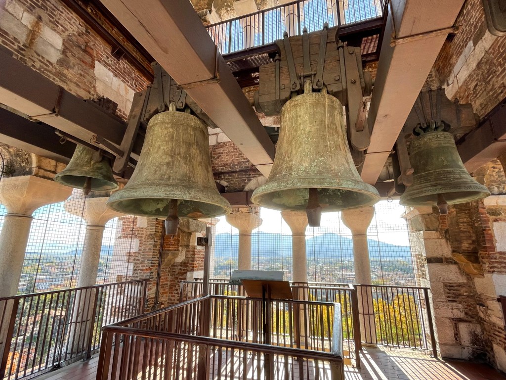 There is a wooden cross with a carving of Christ that is considered to be the oldest wooden relic in Europe. It is also said that it was once in Christ’s tomb. Although it says the cross is located in the cathedral, they were working on renovations in the area it is said to be located. I’m guessing it was in the museum we visited and I didn’t grasp its significance while we were there. After the cathedral, we decided to climb the bell tower. This was no easy feat. It was almost 200 steps and they were not renovated steps. The first section was all stone. It was quite an experience. I was happy that there was only one other person climbing the same time as us. The views from the tops are spectacular, as you can see from my previous picture of the town. You can also see the aqueduct that used to bring water into the city. It spans over three kilometers.