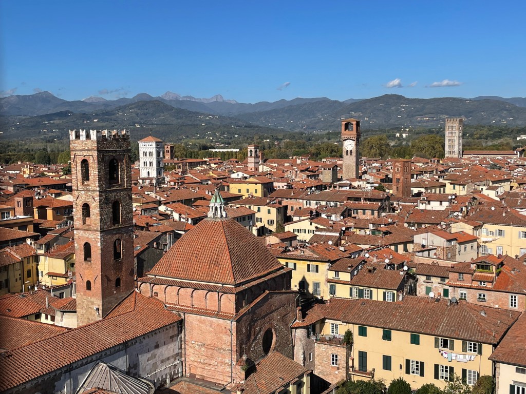 Our next port included Lucca and Pisa. You could also choose to go to Florence, but we wanted to check out some new towns (even though we loved Florence). We were going to take the trains on our own, but Jef found a tour that would take us by bus that we thought would be easier and get us inside the towns faster. We were glad that we chose the tours. The shuttle from the port dropped us off in the same square that the tour buses met. I think the drive to Lucca took about 45 minutes to an hour. Tuscany is a beautiful section of Italy and I enjoyed watching the scenery as we drove. The tour guide told us a few things about the area. We even drove by some marble mining, which was really neat.