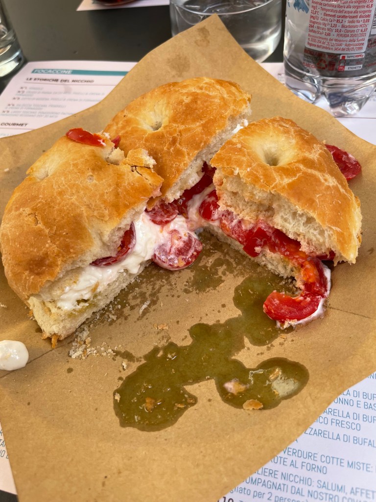 We were starving at this point and hoped to find some pizza. However, we found something better: a place that had fresh focaccia sandwiches. Jef had one with sliced tomatoes and fresh mozzarella and I had one with cherry tomatoes and burrata. Delicious!