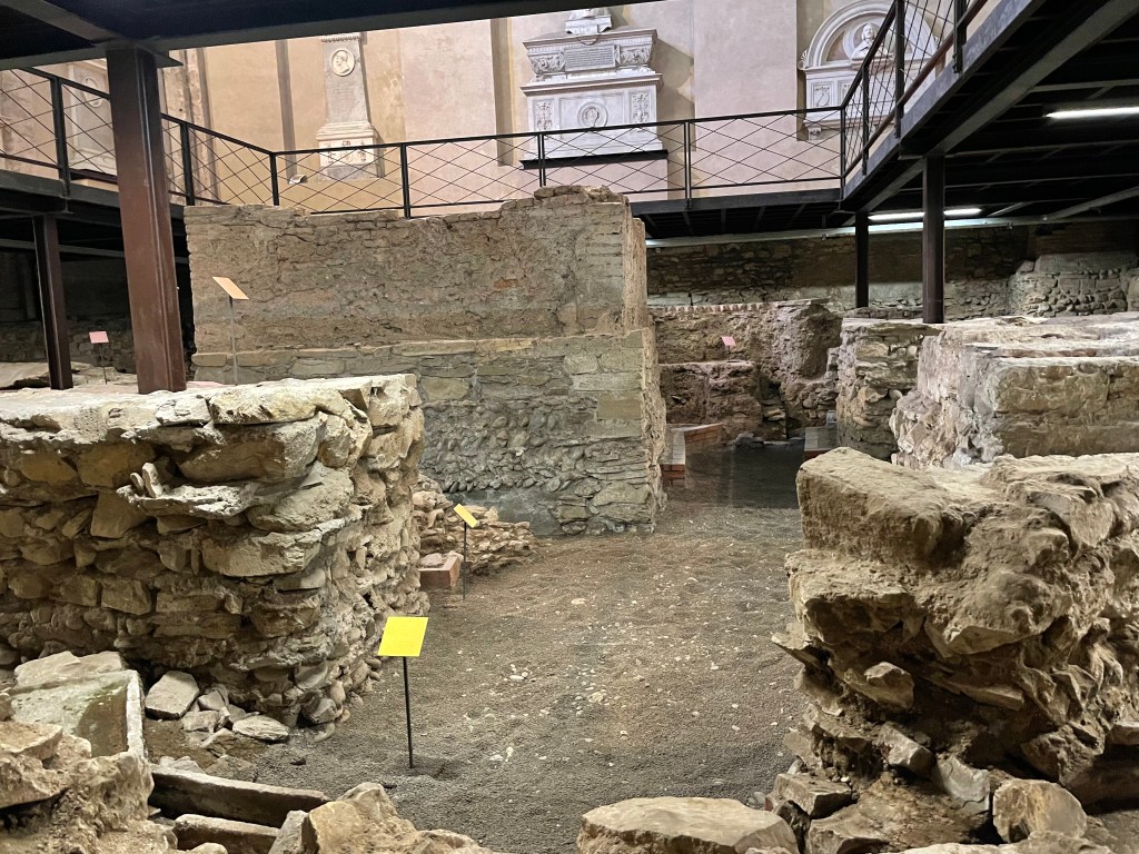 The neat part of this church was that they have excavated the Roman ruins of the Baptistery and it’s underneath the present day church. Even cooler is that you can walk down there and explore! We were the only people that were there. I love seeing old mosaic floors. They are still working on the excavations.