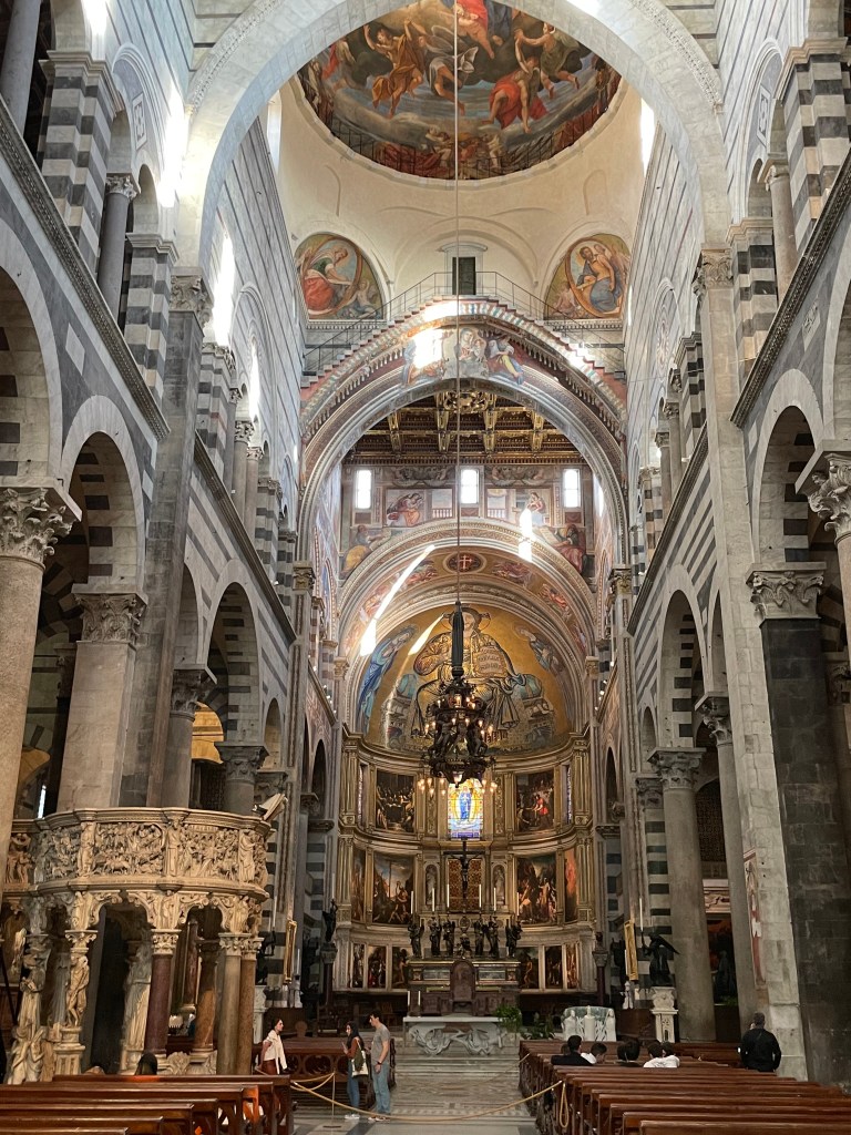 We met our tour guide on time and got on the bus to head to Pisa. It took about 45 minutes to get there. I was very excited to see the leaning tower of Pisa, even though I knew we would not be able to climb it. You need to get a ticket months in advance in order to go inside. They give you a timed ticket. You can also enter other buildings in the square: Cathedral, Baptistery, Camposanto, Sinopie museum, and the Opera del Duomo museum. We opted to enter the Cathedral. Although they gave us a timed ticket, it is free and you can enter any time you wish, but you must have a ticket. Luckily our tour guide told us this before we exited the bus. We had a bit of a walk from the bus parking lot to the Square of Miracles. Before you even enter the square you walk through a ton of stalls selling numerous souvenirs. There is a massive number of people there and only thins out when you get into the huge Square of Miracles.
