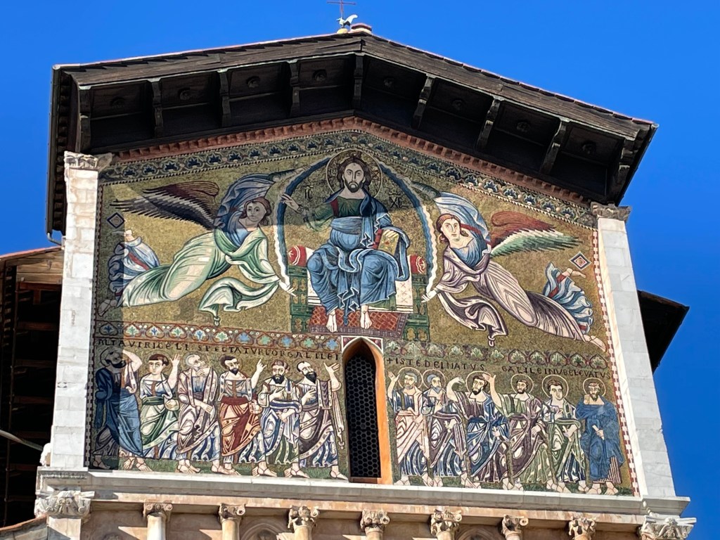 The guide gave us a few suggestions as to where to visit and then left us to our own devices. I think my favorite thing about Lucca was the lack of obvious tourists. There were very few people out and about and I felt that it made it a more authentic visit for me. Jef and I wandered the streets and found the Lucca Cathedral. The entrance fee had a deal that included the cathedral and bell tower, a museum, and another church and bell tower. I may have mentioned before, but I’m not a big fan of churches. I think it’s because I visited so many while living in Spain. I admire the architecture, but they are all eerily similar even when extravagantly ornate. The cathedral was no exception.