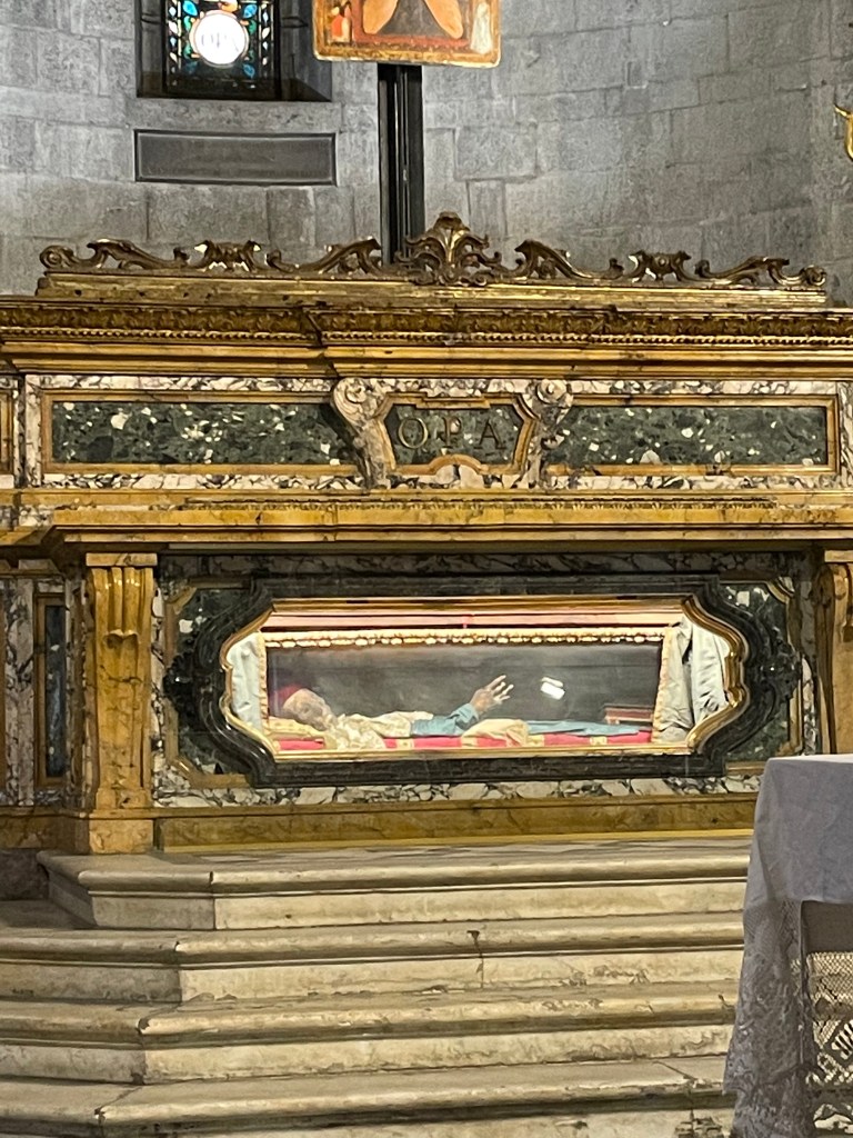 After lunch we stopped in the church of San Michele and saw what looked to be a mummified skeleton. I read a little about him in the church and found that he was a pilgrim who was said to have miraculous powers. His name was San Davino and he died in the 1100s. After we returned home, I tried to look him up and found very little information. Instead, I found that there is ANOTHER skeleton saint on display at the church with the beautiful facade. We did not go into that church and therefore missed the patron Saint of Lucca, Saint Zita, patron saint of servants and lost keys, who died over 700 years ago. Neither of these skeletons were mummified. They are said to be miraculously intact due to their saint status. The Catholic Church has a lot of artifacts that were once part of the human body. I find it a bit odd.
