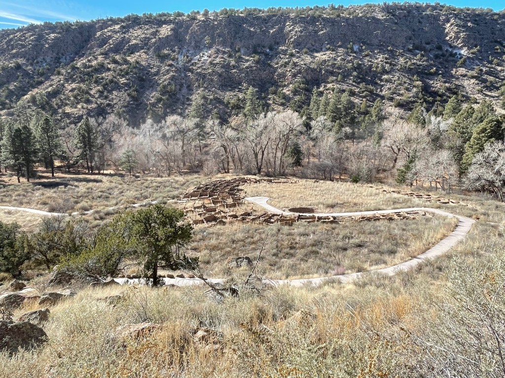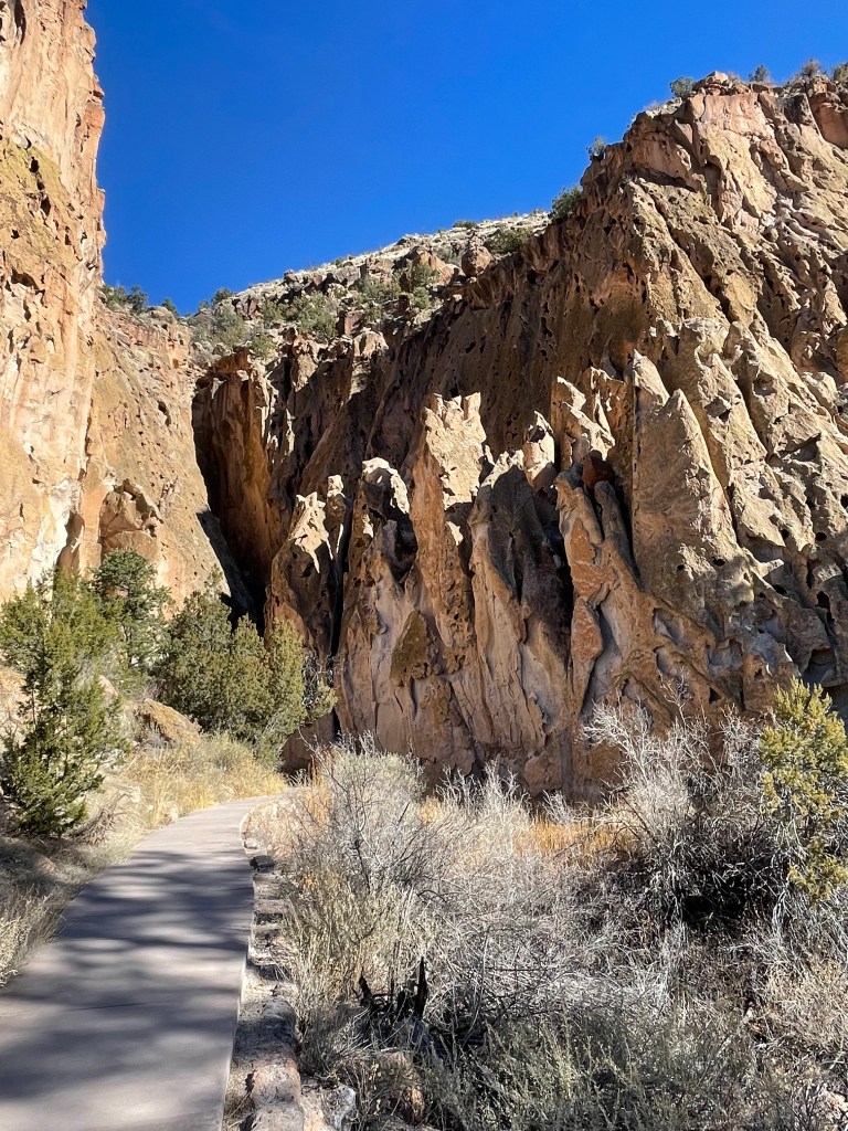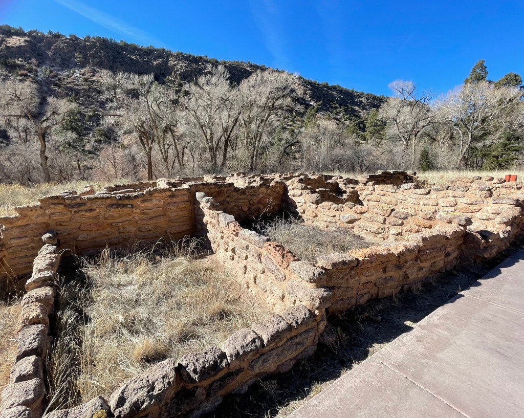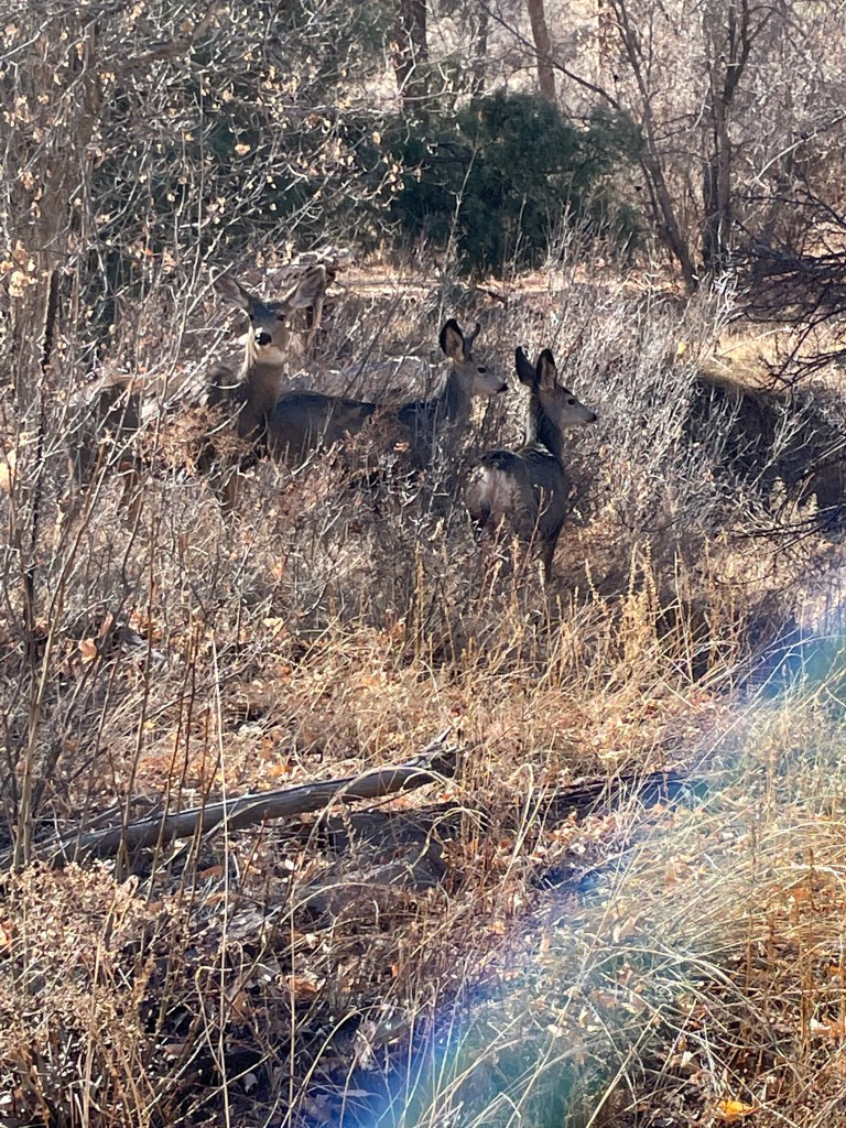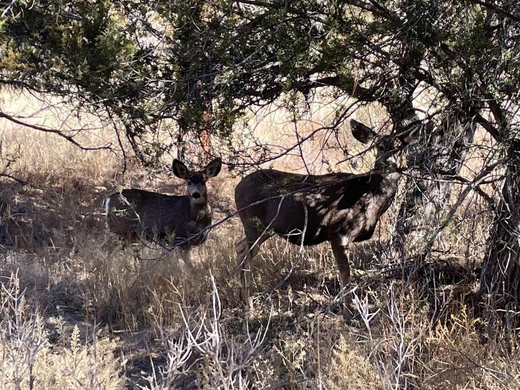 We drove through the Bandelier National Monument and saw maybe two cars as we made our way to the visitor’s center. There were very few cars in the parking lot and the air was cold enough for me to wear a scarf and hat. We walked out on the boardwalk and almost immediately saw six deer right next to us. They did not seem too upset by our presence. We saw two people leaving right after the deer and we told them where they were located. They gave us their park map, which I really appreciated because we could read about what we were seeing and not have to look it up on our phones.