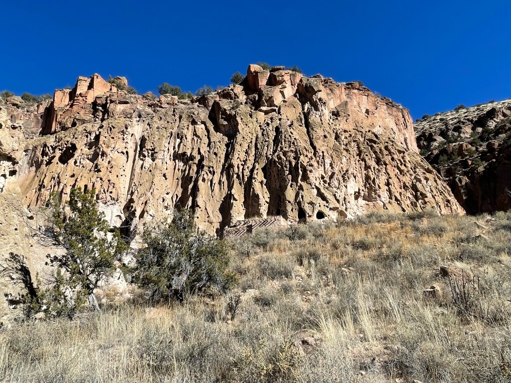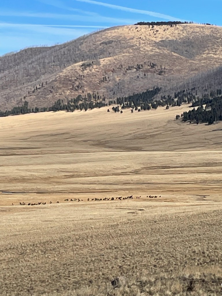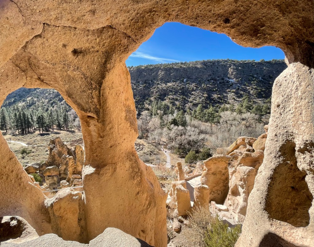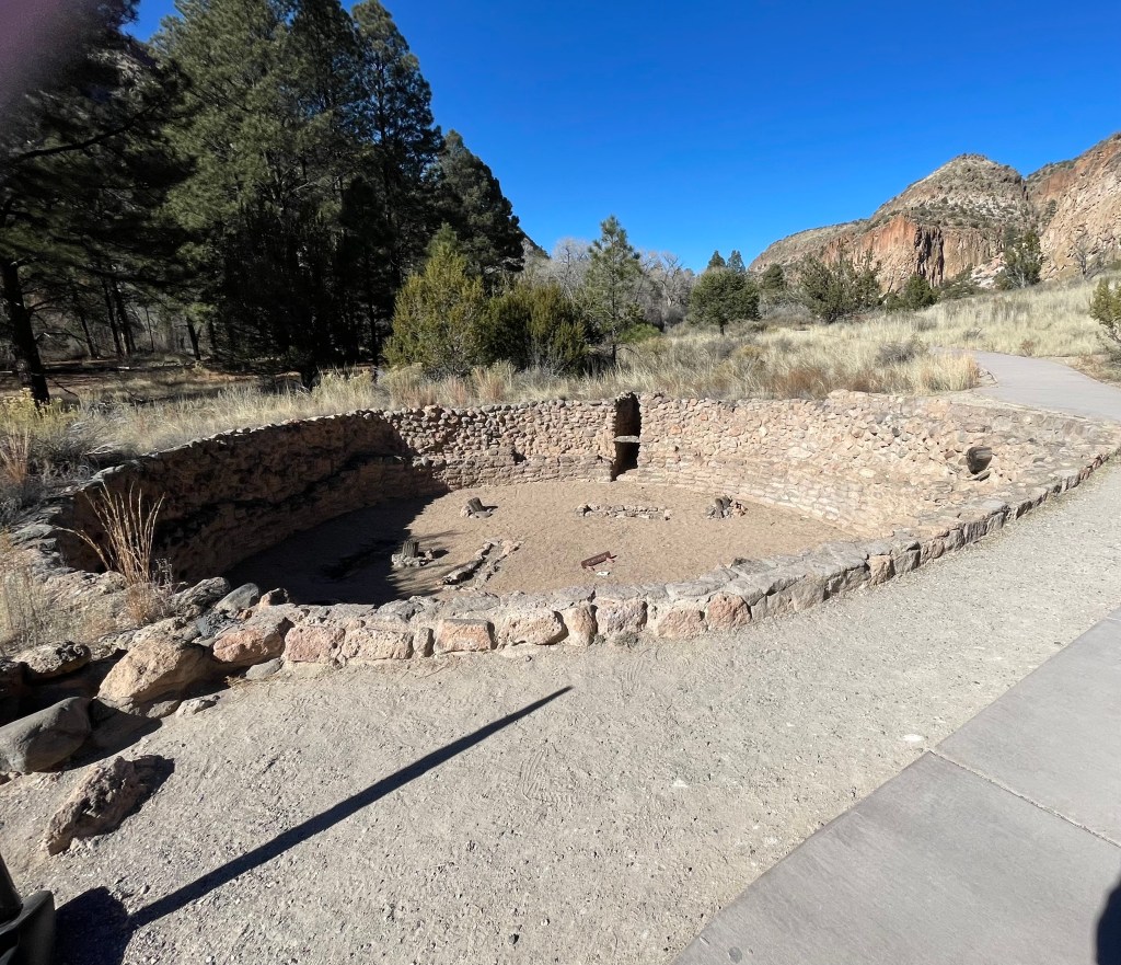 We drove through the Bandelier National Monument and saw maybe two cars as we made our way to the visitor’s center. There were very few cars in the parking lot and the air was cold enough for me to wear a scarf and hat. We walked out on the boardwalk and almost immediately saw six deer right next to us. They did not seem too upset by our presence. We saw two people leaving right after the deer and we told them where they were located. They gave us their park map, which I really appreciated because we could read about what we were seeing and not have to look it up on our phones.