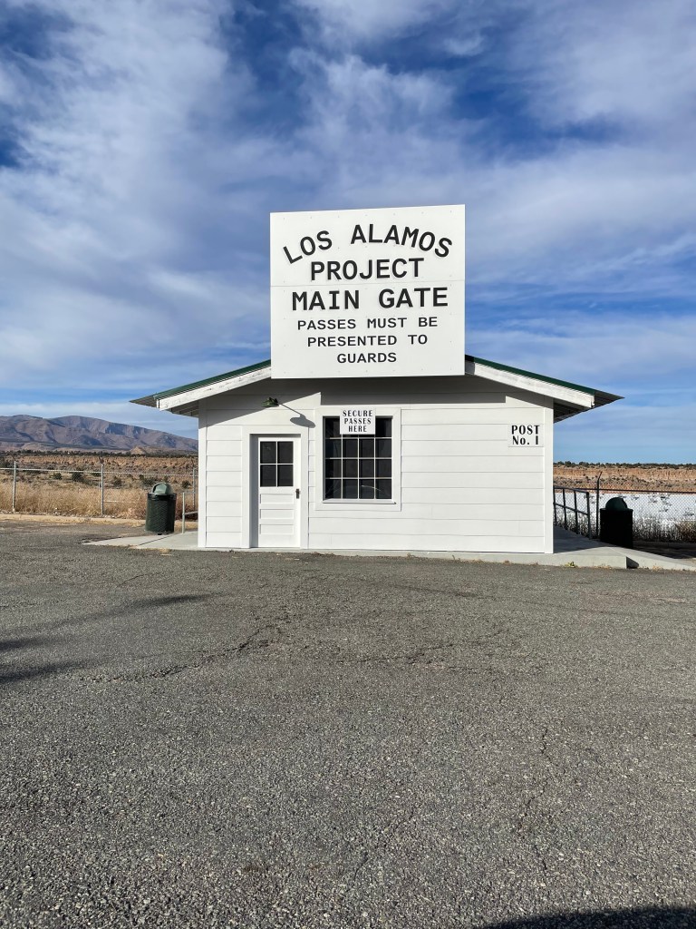 After Bandelier National Monument we took a drive to Valles Caldera National Preserve to see the caldera. We spotted an entire herd of elk and had a wild dog run out across the road in front of us. We then drove through Los Alamos. We had to stop at a security checkpoint that warned our car could be searched. We had to show our license and the guard told us not to take any pictures or videos for the next two and a half miles. If he had not said anything to me, I would have never even though about taking a picture. The labs are still super top secret. We went to the Bradbury Science Museum and learned all about how the labs were created and how they built and tested the atomic bomb. The only picture I took was of the old checkpoint area.