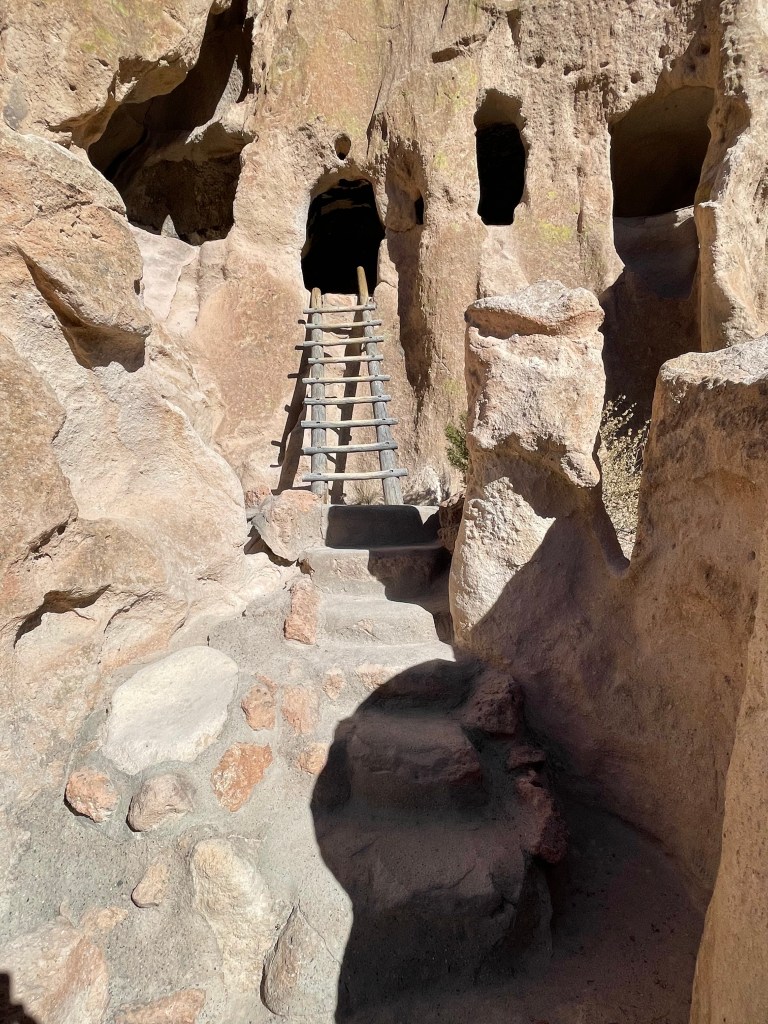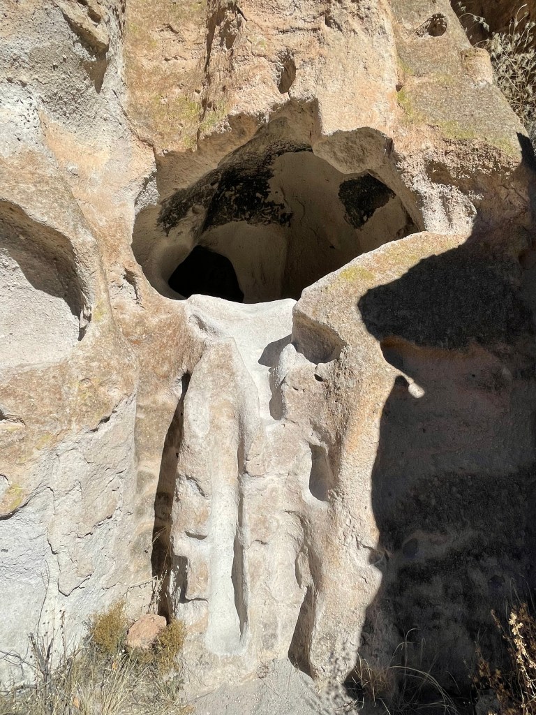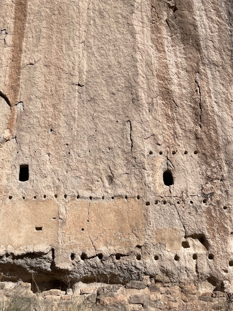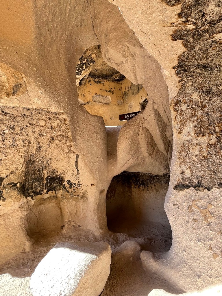 The coolest part of this visit was being able to climb up into the cliff dwellings. There are three that you can enter. However, when we were there only two were open. The third one was a kiva and it was closed because it was vandalized. (It makes me so mad when I find out people ruin these experiences for others, plus they totally disrespect the history and the people.) The cave rooms are referred to as cavates. Although the rock is soft, it still would have been very difficult carving these rooms with the stone tools they utilized. The walls were usually plastered and the ceilings were smoke blackened to harden the volcanic tuff and make it less crumbly. The park service has to blacken the ceilings periodically to keep it hardened. The house picture is a reconstruction, but it turns out it’s not accurate since they would have entered through a doorway in the roof.
