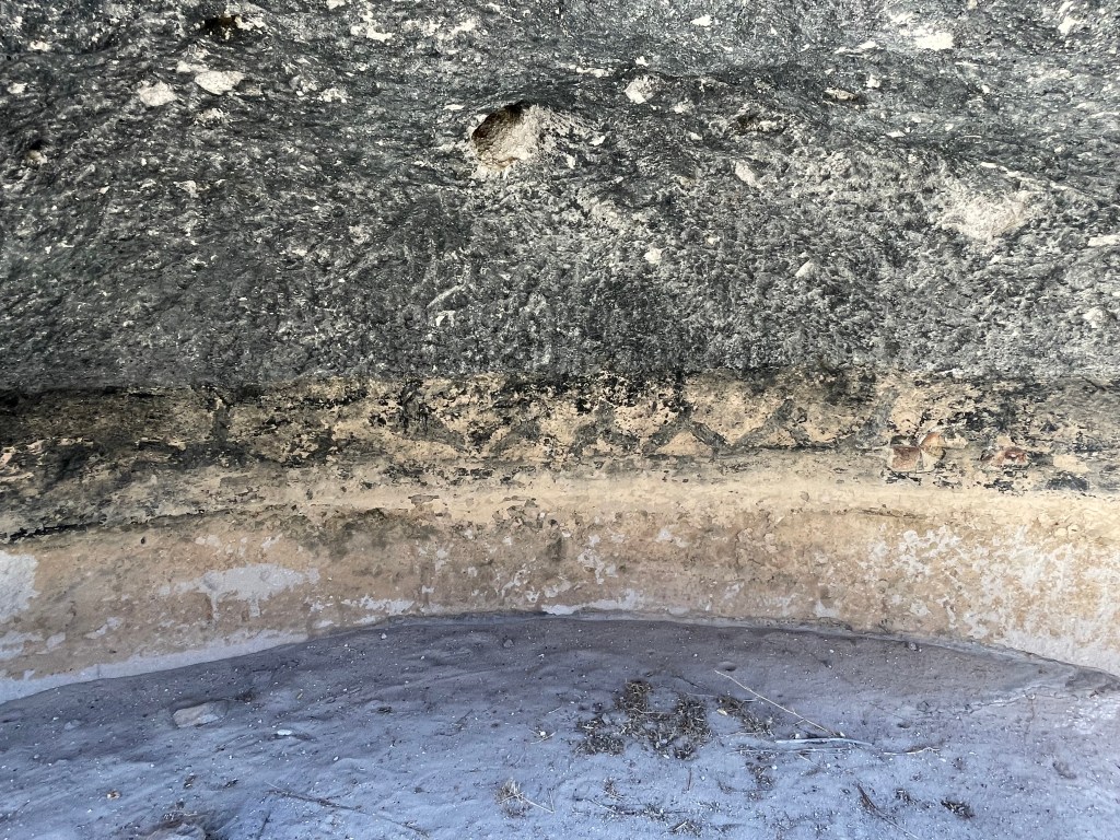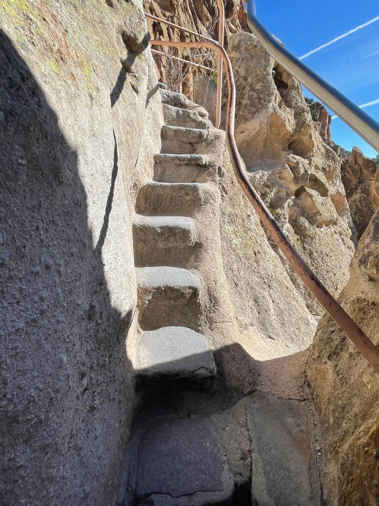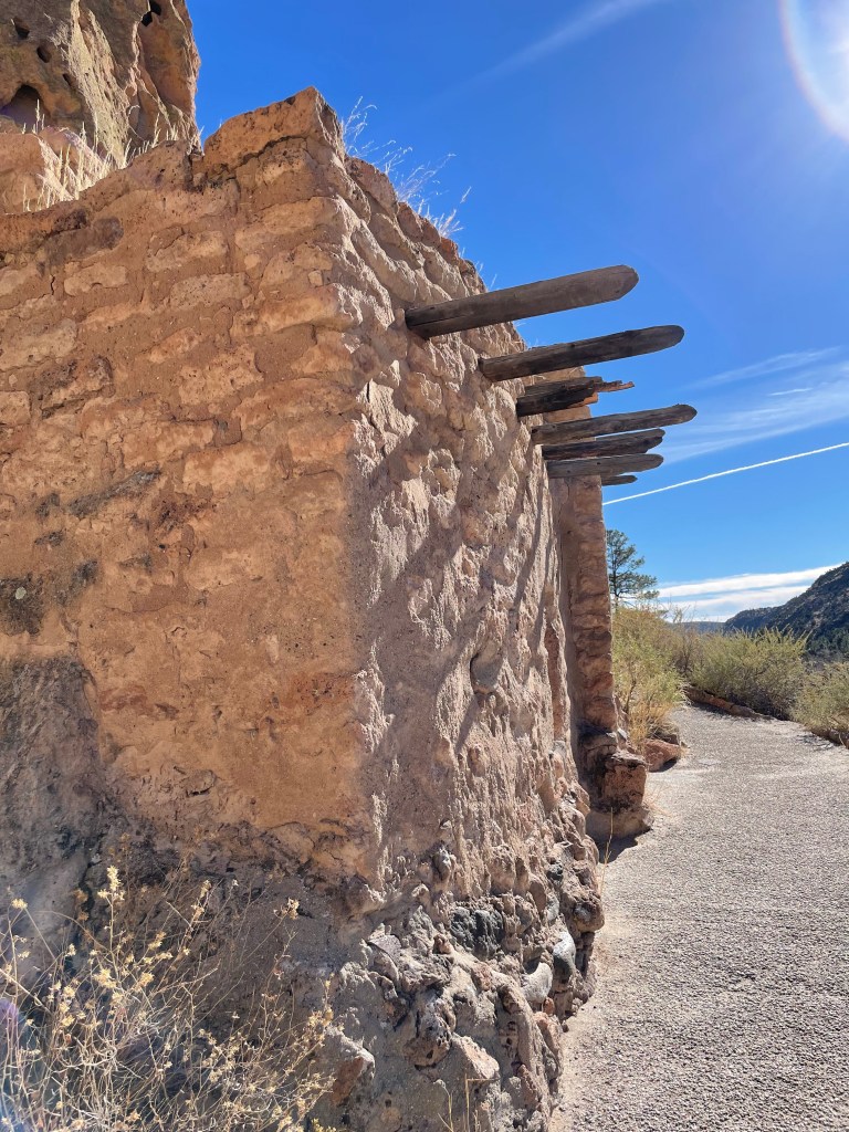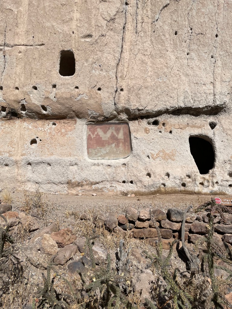 The coolest part of this visit was being able to climb up into the cliff dwellings. There are three that you can enter. However, when we were there only two were open. The third one was a kiva and it was closed because it was vandalized. (It makes me so mad when I find out people ruin these experiences for others, plus they totally disrespect the history and the people.) The cave rooms are referred to as cavates. Although the rock is soft, it still would have been very difficult carving these rooms with the stone tools they utilized. The walls were usually plastered and the ceilings were smoke blackened to harden the volcanic tuff and make it less crumbly. The park service has to blacken the ceilings periodically to keep it hardened. The house picture is a reconstruction, but it turns out it’s not accurate since they would have entered through a doorway in the roof.