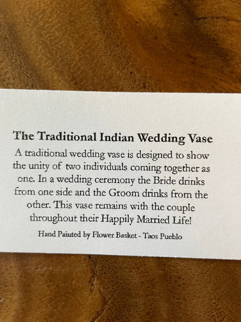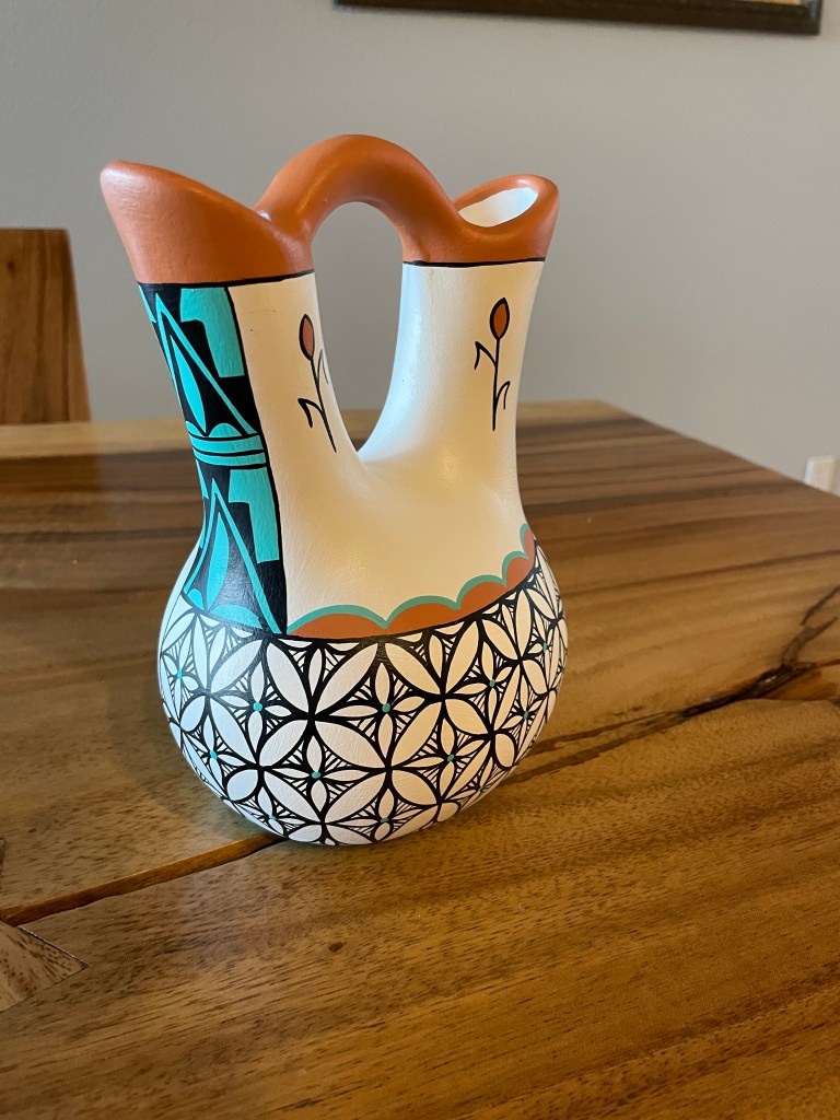 The colorful doors indicate a shop. We went inside every shop that was open. The top picture is of a coffee shop. They made us some delicious hot chocolate. The first shop we entered was the light blue door on the right. It had beautiful pottery. We met the artist since she was also the shopkeeper. She also had some paintings by her son. Her pottery was the most colorful and interesting that we saw and after walking around the entire pueblo, we returned to buy this bridal vase.