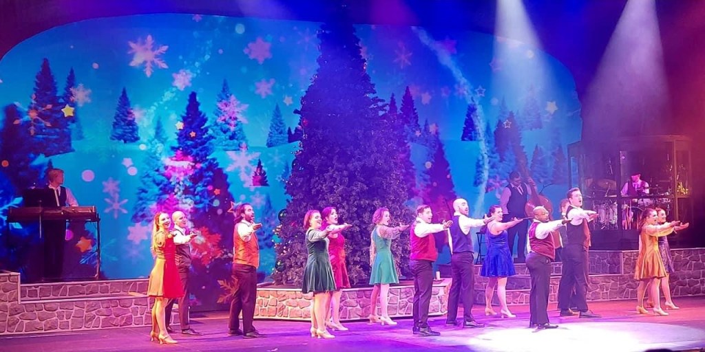 After the show, we walked to a section that had fewer people. We found a Barn Swing. It was basically a giant swing that fit about eight people on each side and took you up high enough that you were facing the ground at a parallel angle. We waited for about 15 minutes and I started to get nervous, but it was really fun. At the end of the area we were in there was a wooden roller coaster called Outlaw Run. Jef loves roller coasters and there was less than a five minute wait. He said it was amazing. He didn’t think it would go upside down and it did. He loved it. We had to find the next theater because the show was going to start in about half an hour. It’s a good think we went early. The line snaked so far around the park that I thought we wouldn’t get in! There is no one working there to tell you where the line begins or ends or looks out for people jumping the line. I thought it was pretty disorganized. We found good seats to the show, which was basically Christmas songs. This show was so much better than the one we saw in Branson. There was no background track, they sang the whole time and they tried to turn all the songs into a theme of people getting together for the holidays. I really enjoyed it.