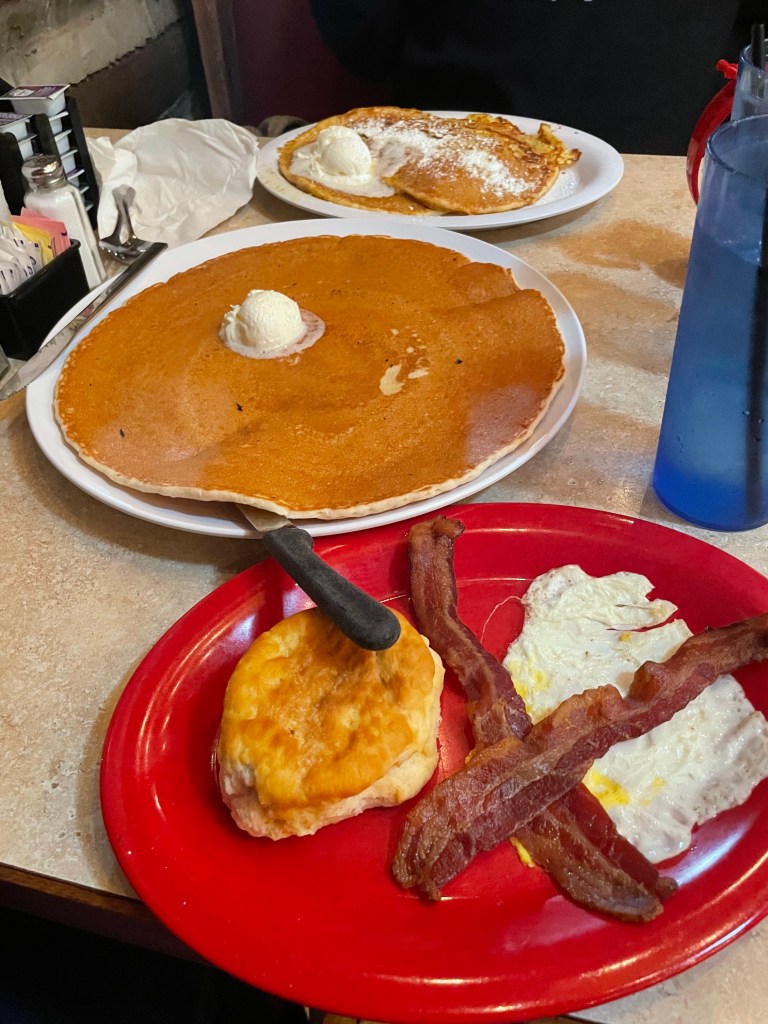 As I mentioned, we took a break in the middle of browsing the toy collection for lunch. We went to the Pickin Porch Grill at the Branson Craft Mall. You order at the counter and they bring you your food. I really enjoyed my TBA, which was a Turkey, Bacon, and Avocado sandwich. The fries that come with it are also delicious. After eating, we wandered around the craft mall, which was bigger than we expected. After finishing our tour of the Toy Museum, we stopped for the second time at this drive through coffee shop called Expresso Branson. They had a specialty hot chocolate with all three chocolates (milk, dark, and white) mixed together with peppermint. Delicious. That evening for dinner we finally got a table at Billy Gail’s Cafe. We had breakfast for dinner. I didn’t realize how big my pancake was going to be. Sadly, it was not as good as it looked.