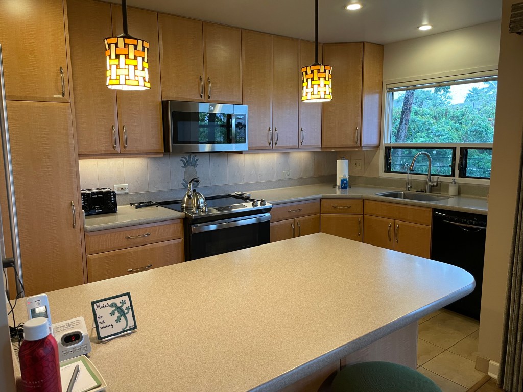 Our last stop was at the blowhole. We didn’t take any pictures because it was pretty far down the hill. We could see it and there were several people standing right next to it. It started to sprinkle while we were watching and luckily we traveled far enough on the highway to reach the point that actually had two lanes. It started raining in earnest as we headed to our hotel. We are staying at another Hyatt property. It’s called Wailea Ekolu village. We basically have a condo with a a full kitchen, two bathrooms, and even a washer and dryer. We would have a beautiful view of the water, if we could see through all the rain. Again, we used our credit card points to get this hotel. I was shocked at how expensive it would be if you booked it now.